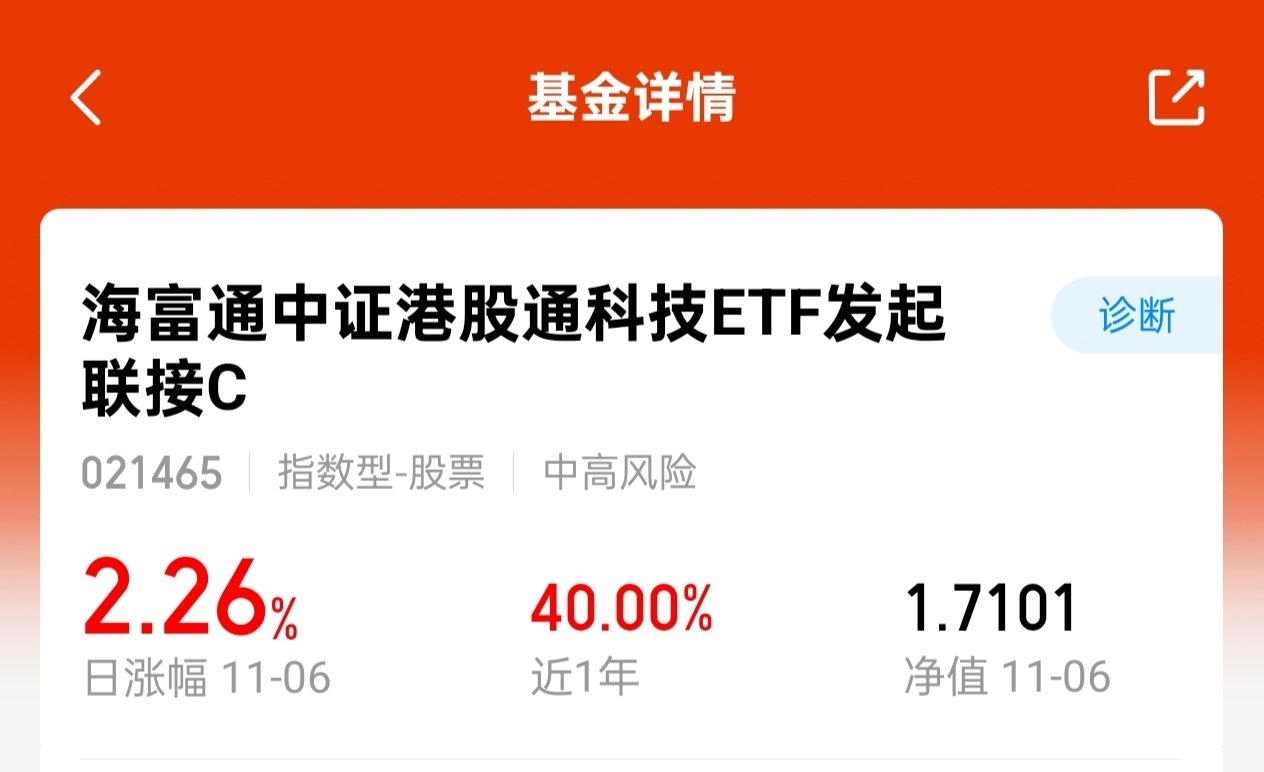 $海富通中证港股通科技ETF发起联接C$ 今日上涨2.26%,整体表现不错,近期业绩稳定波动小,回撤低,希望继续保持!