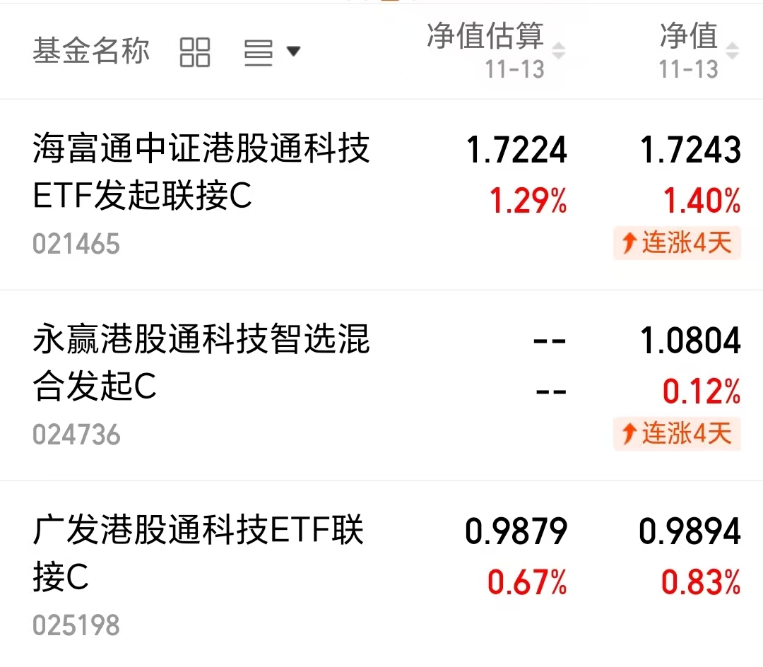$海富通中证港股通科技ETF发起联接C(OTCFUND|021465)$上涨1.4%;