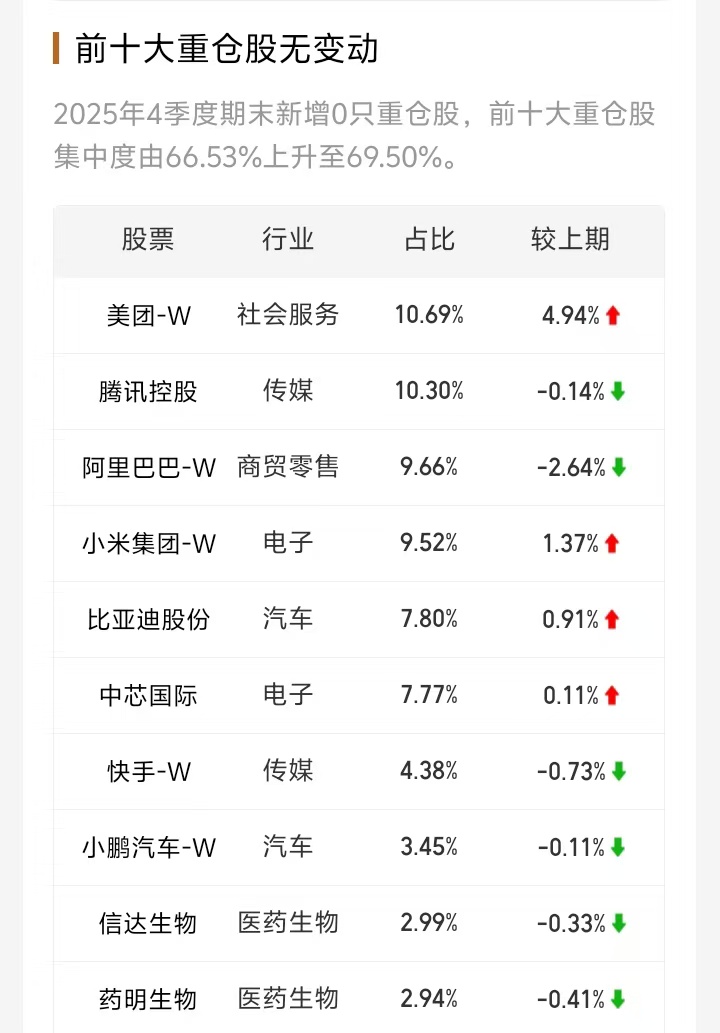 因此,海富通中证港股通科技ETF联接基金的投资组合间接持有这些科技巨头股票。其前十大重仓股与中证港股通科技指数的权重股高度重合,主要包括腾讯控股、美团-W、阿里巴巴-W、小米集团W、比亚迪股份、中芯国际、快手-W等港股市场市值最大、最具代表性的科技公司。截至2025年底,该联接基金通过持有ETF,前十重仓股合计占基金资产净值的比例高达约69.5%,显示出相当高的集中度。这种配置使基金能够充分分享港股科技龙头企业的成长红利,但也意味着基金表现将显著受这些权重股表现的影响。