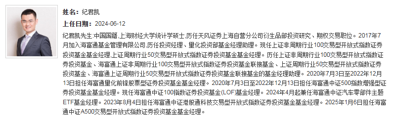 纪君凯:现任海富通基金指数与量化投资部总监,同样拥有硕士学位。纪君凯具有多年量化研究和投资管理经验,曾参与管理海富通上证周期行业50ETF、上证非周期行业100ETF等多只交易所交易基金。他自2020年起开始管理ETF产品,对指数基金的运作和市场交易机制非常熟悉。在本次产品中,纪君凯负责日常的投资运作和ETF投资管理,保证基金高效跟踪指数。