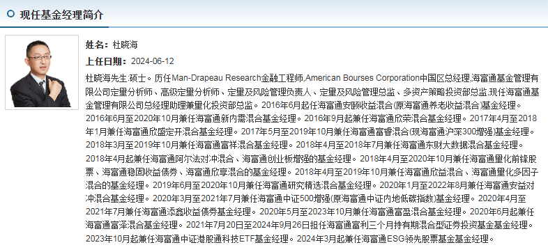杜晓海:现任海富通基金总经理助理兼量化投资部总监,拥有硕士学位。他曾历任海富通基金定量分析师、高级定量分析师、定量及风险管理负责人、多资产策略投资部总监等职务,具备深厚的量化投资背景。杜晓海自2016年起开始管理公募基金,目前同时管理着多只指数型和量化对冲基金,包括海富通中证500增强、海富通阿尔法对冲混合等。他管理的指数增强基金在历史上取得了不错的超额收益,体现其量化投资能力。在本次产品中,杜晓海主要负责量化投资策略和风险控制,确保基金紧密跟踪基准。
