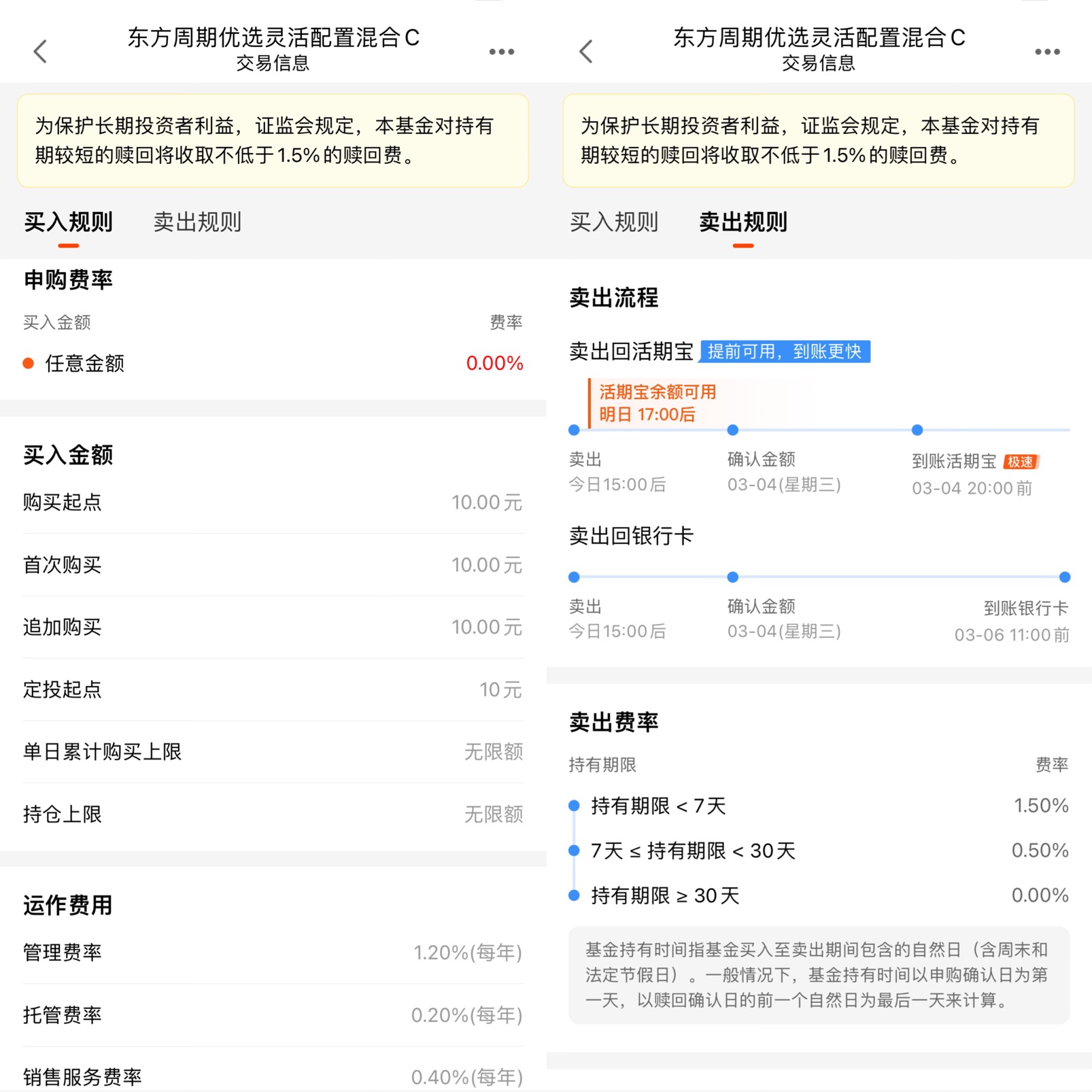 再说说费率,这也是普通投资者最关心的点之一。东方周期优选灵活配置混合C的申购费率是0.00%,也就是说,买入不需要花一分钱手续费;持有期限超过30天,赎回费率也是0.00%,只有持有7天以内收取1.5%、7天至30天收取0.5%的赎回费,这个费率设置,非常适合长期持有,也适合投资者根据化工板块的行情节奏,进行灵活的波段操作。基金的运作费率也不高,每年的管理费1.20%、托管费0.20%、销售服务费0.40%,在同类周期主题基金中,属于中等偏低的水平,长期持有下来,不会因为费率过高而侵蚀收益。