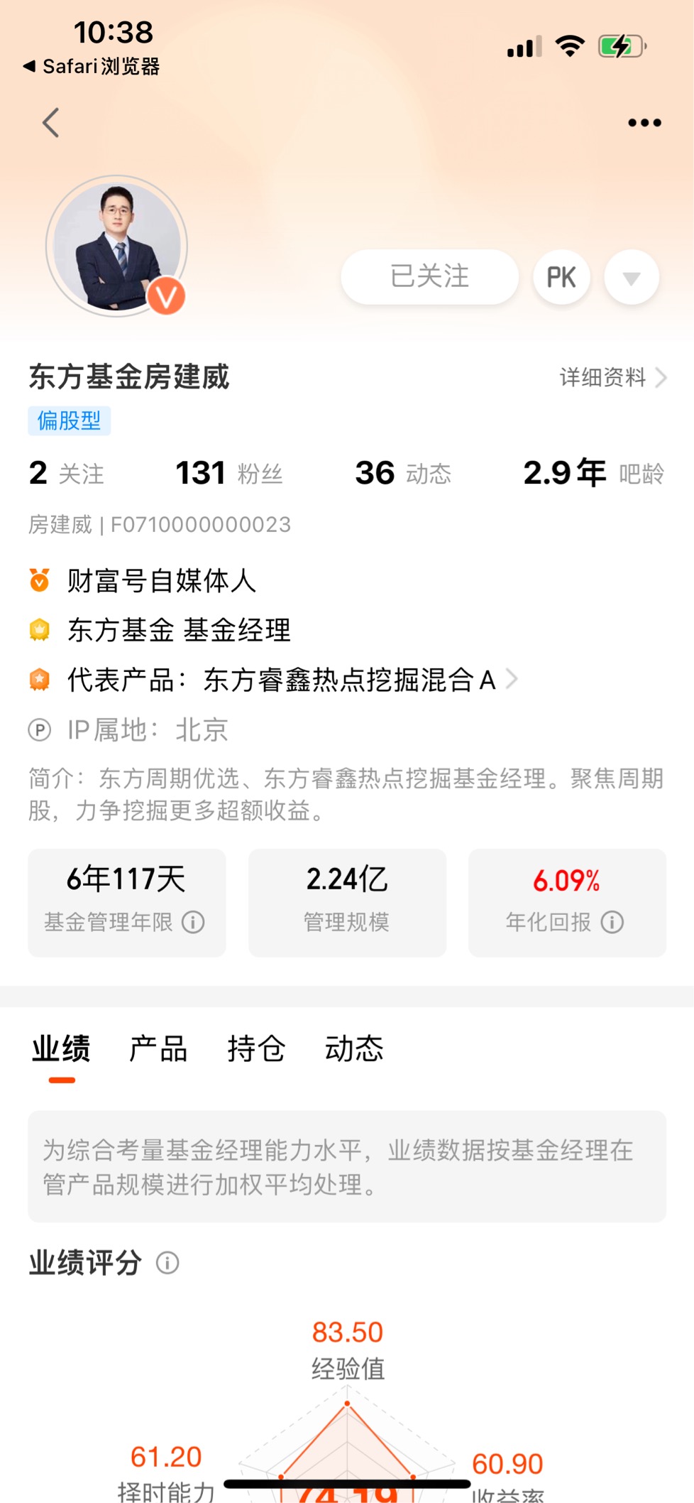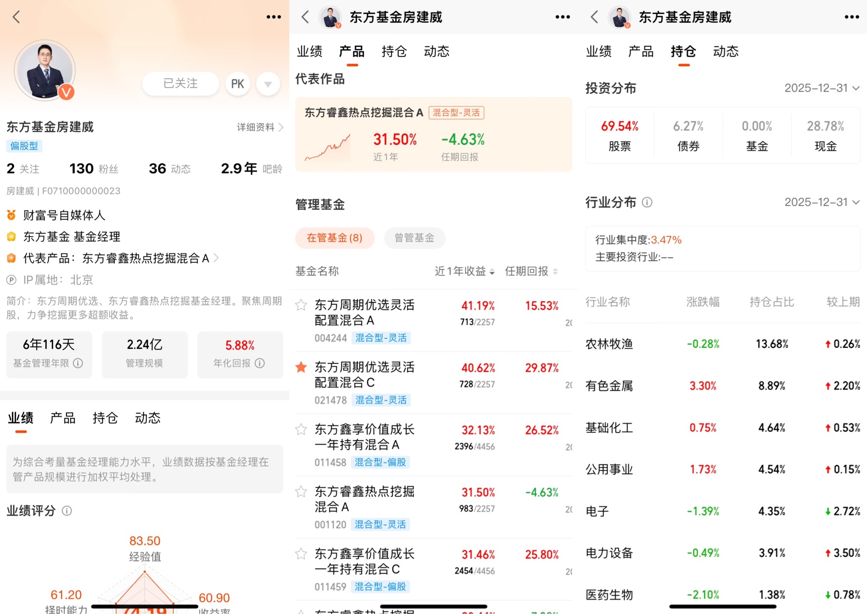 基金经理房建威,是这只基金的“灵魂人物”,也是我推荐它的核心原因之一。很多投资者选基金,容易忽略基金经理的能力,但在周期基金里,基金经理的“择时能力”和“行业研判能力”,直接决定了基金的业绩。房建威有13年证券从业经验,虽然管理这只基金的时间只有1年多,但他在周期板块的投资上,已经形成了成熟的体系。从他的过往业绩来看,他管理的产品年化回报能达到5.88%,在周期股的波动行情中,他的择时能力评分61.20,抗风险能力评分更是高达98.20,稳定性评分96.70。这组数据意味着,他不仅能精准捕捉周期板块的上涨机会,更能在板块波动时,控制好风险,避免投资者出现大幅亏损。