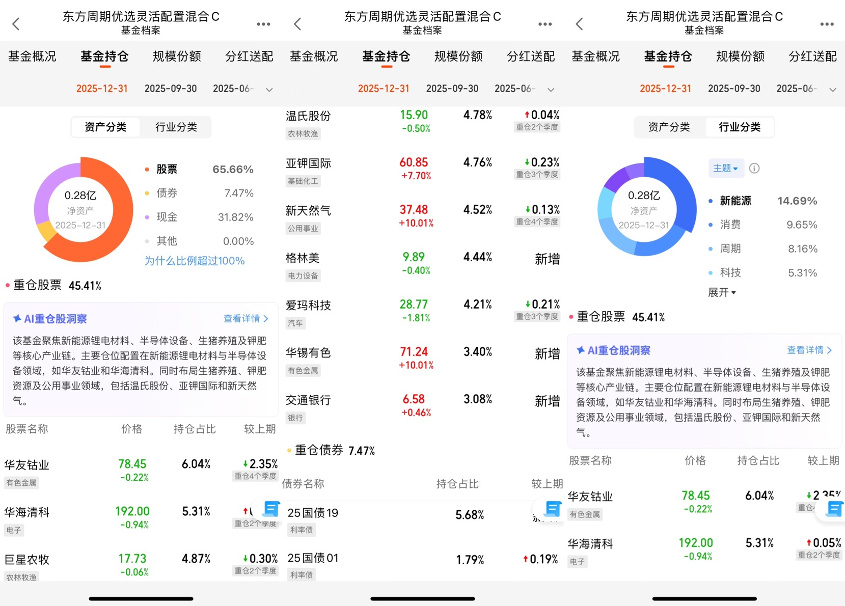 还有一个细节,让我对这只基金更加认可——它的持仓集中度。基金的前十大重仓股占比45.41%,这个比例非常合理。既保持了适度的集中,能精准捕捉化工等核心周期赛道的上涨机会,又不会过度依赖单一标的,避免了“押注单一股票”的风险。比如在化工相关的持仓中,既有华友钴业这样的新能源化工龙头,也有华海清科这样的半导体化工材料企业,还有温氏股份、巨星农牧等与化工产业链相关的企业,这种多元化的持仓,能有效分散风险,在化工板块出现细分赛道分化时,保持基金业绩的稳定性。