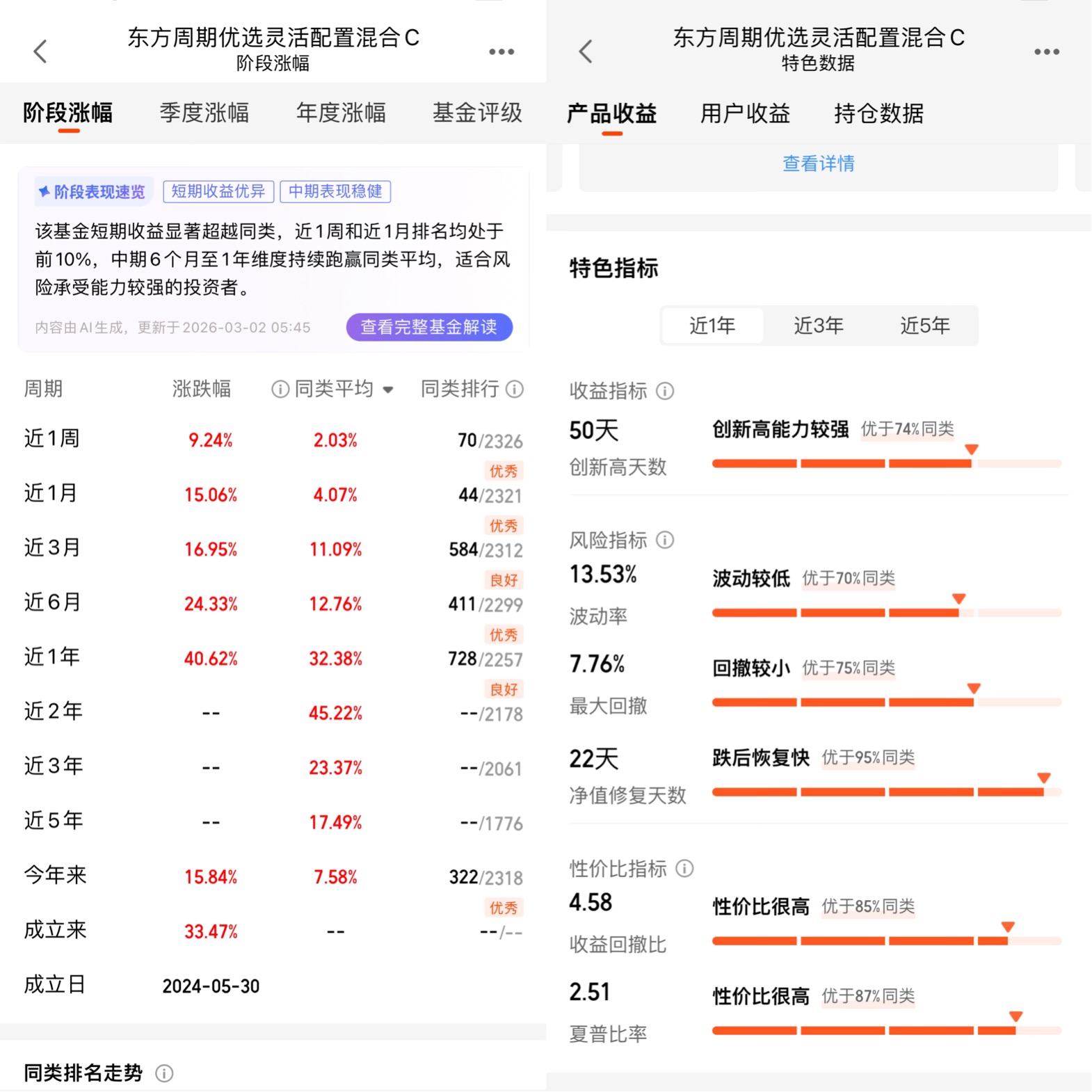 从业绩表现来看,这只基金的成绩单,足以证明它在周期板块投资上的实力。截至2026年3月2日,基金成立以来的收益率达到29.87%,近1年收益率35.49%,远超同类平均的29.37%;今年以来的收益率也达到了12.71%,在2331只同类基金中排名479位,属于“优秀”水平。短期来看,近1周涨幅6.29%,近1月涨幅5.00%,都大幅跑赢同类平均;中期来看,近6月涨幅21.17%,近1年涨幅35.49%,持续跑赢同类。更难得的是,它在实现高收益的同时,还控制住了风险。基金的最大回撤只有7.76%,优于同类平均的25.3%;波动率13.53%,优于70%的同类基金;净值修复天数仅22天,优于95%的同类基金。这就意味着,这只基金是“能涨、抗跌、跌后恢复快”的优质产品,对于风险承受能力中等的普通投资者来说,非常友好。