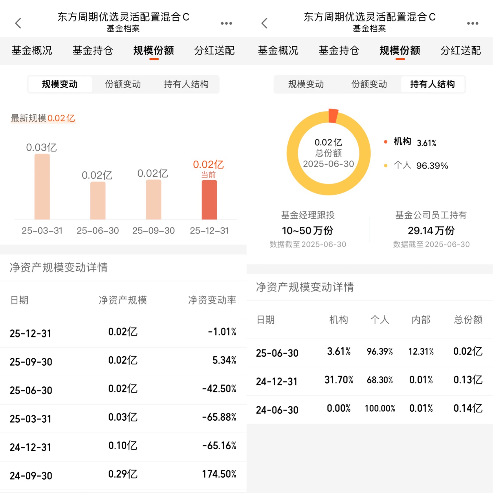 可能有投资者会担心,这只基金的规模只有0.02亿元,是不是太小了,存在流动性风险?其实,对于周期主题基金来说,“小规模”反而成了优势。首先,0.02亿元的规模,让基金经理的调仓换股更加灵活。化工板块的行情节奏快,细分赛道的轮动也快,大规模基金调仓时会面临“冲击成本”,而小规模基金可以快速加仓涨幅初期的化工龙头,也能在板块出现分化时,及时减仓高位标的。其次,这只基金虽然规模小,但机构占比3.61%,基金经理本人和内部员工也跟投了很多,这意味着机构和基金经理自己,都对这只基金的投资逻辑和业绩前景有信心。而且,基金的规模一直保持稳定,并没有出现大幅赎回的情况,流动性风险完全在可控范围内。
