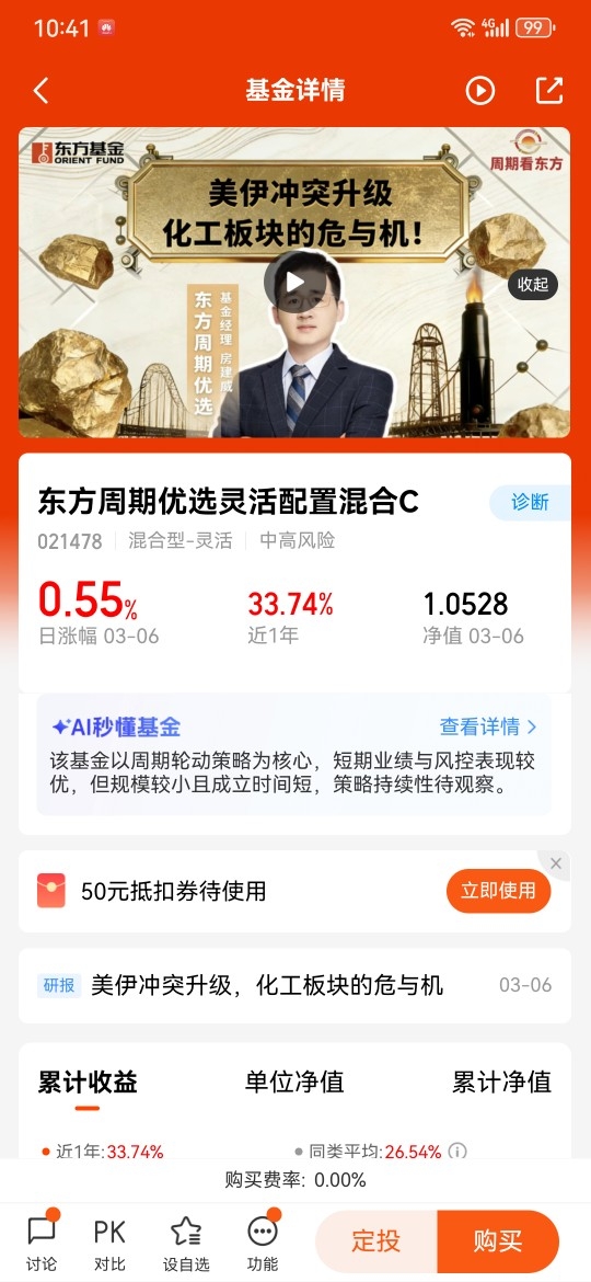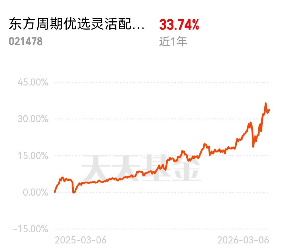 2026年我看好化工板块,化工板块2025年6月开始至今,呈上涨走势,受国内供需改善、价格上涨、反内卷后行业向好,以及国产替代下高端化工产品发力,多重利好下,化工板块处于上涨周期。而上周中东战争爆发,对石油化工是利好,每逢有战争爆发,石油价格都会上涨,而且看目前的形势,短时间内不会结束,所以石油化工板块未来有可能继续上涨。$东方周期优选灵活配置混合C$ @东方基金