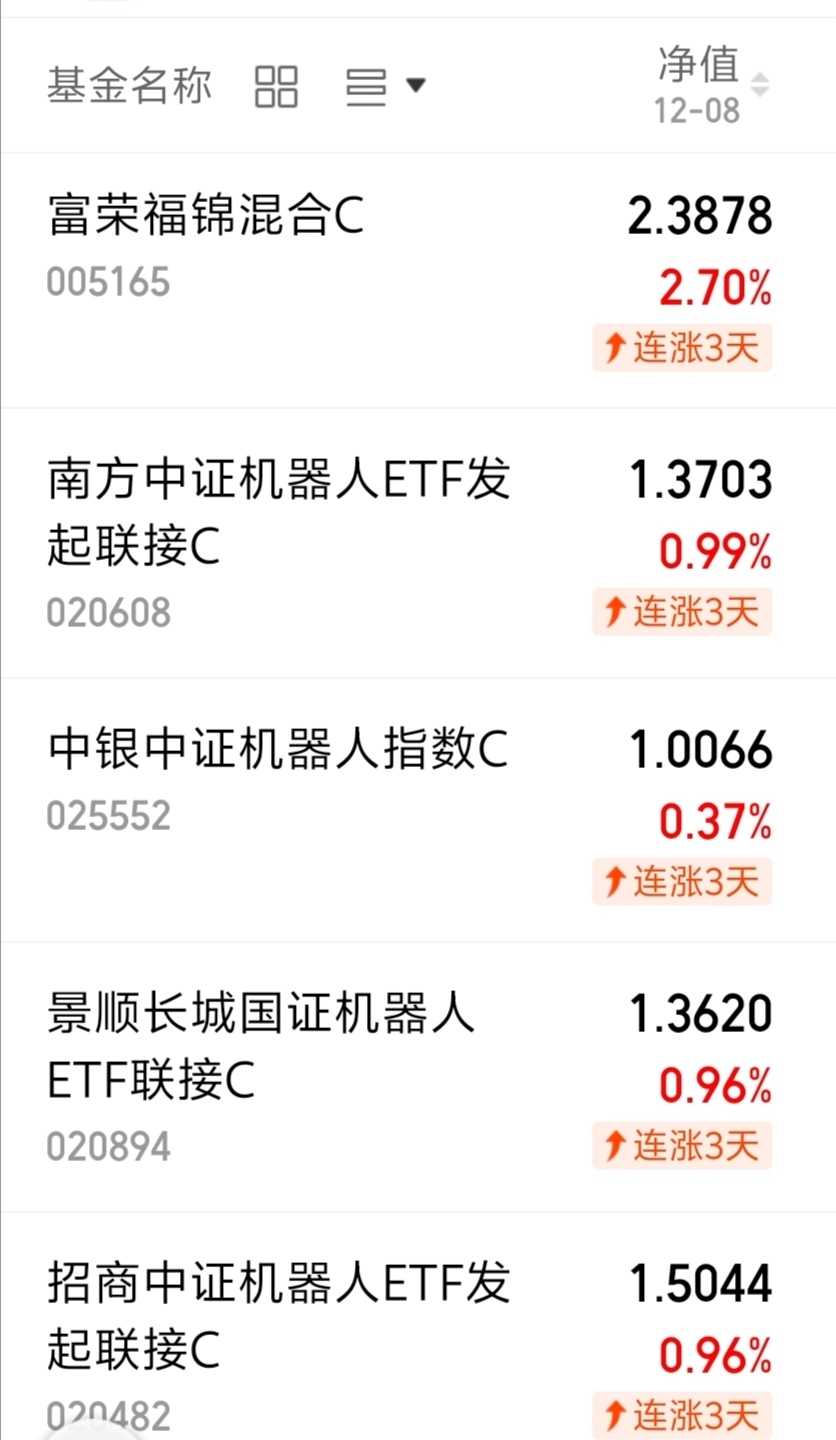 还是机器人板块吃香啊,$富荣福锦混合C$ 今天继续上涨,大涨了2个多点,业绩杠杠的,连涨三天就涨了8个多点,吃肉机会来了,可得冲起来啦