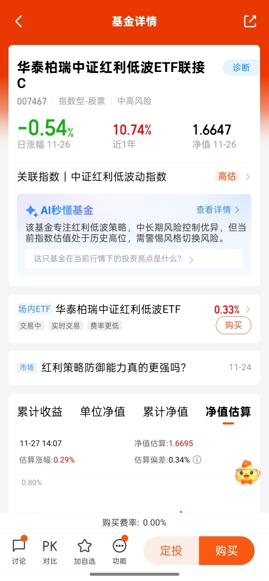 现在市场震荡得让人没脾气,不少人都在找能稳稳拿收益的方向,而红利低波行情最近真是逆势吃香!当下利率处于低位,传统理财收益不高,红利低波靠着高股息和低波动的特点,成了很多资金的避风港——选的都是持续盈利、愿意分红的公司,还剔除了那些大起大落的股票,就算市场波动,也能靠稳定分红托底。这种行情下,华.泰.柏.瑞的相关产品就很适配,它紧密跟踪红利低波指数,不瞎折腾,还不用申购费,持有久了赎回费也划算,刚好契合当下求稳的需求。不过要提醒,基金有风险,选择得匹配自身风险承受能力哦~