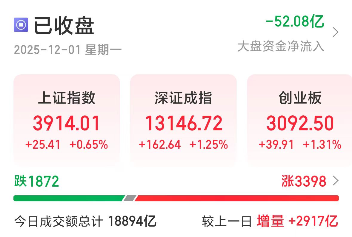 12月第一天大A就给咱送红包,成交量18894亿,较上一交易日增量2917亿,资金活跃度明显提升!昨晚兜兜的复盘可是精准踩中节奏,方向超稳有没有!最近跟上兜兜节奏的小伙伴近几天绝对都是在收获的!