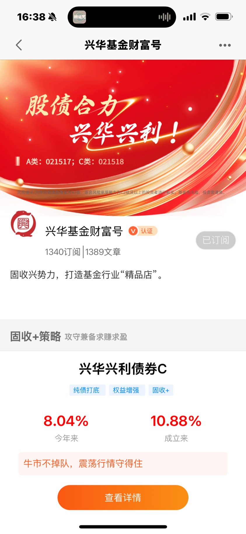 在牛市行情中,适时配置优质的二级债基,或许能更好地应对市场起伏,如果投资者不想错过股市上涨的机会,又不想经历过山车般的颠簸,不妨多多关注兴华兴利债劵A(012517),可采取定投方式体验下“进可攻、退可守”的从容投资吧!@兴华基金