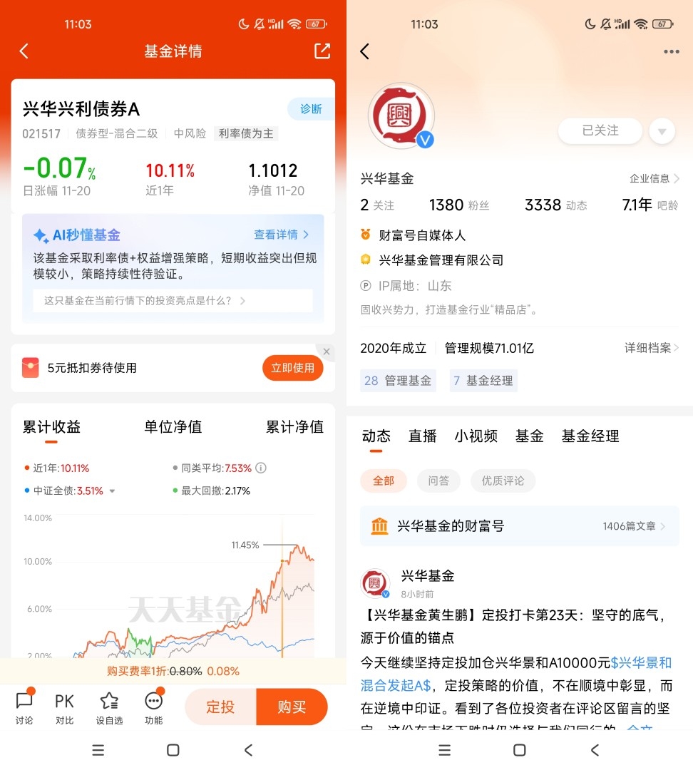 #日定投VS周定投,你更Pick哪一个?# 个人更pick周定投,日定投时间间隔太短,注定波动有限,而定投更适合波动的走势。当前市场已然步入了牛市,只是大盘点位在前期高点附近,受心理锚定效应及年末资金活跃度降低等因素影响,行情开始回调,部分投资者开始畏缩,不知该如何参与市场投资。个人是继续坚持定投收集,相信时间的力量,不做预测只做应对,积极拥抱市场行情变化。同时个人将大部分纯债基仓位转化为固收+产品,认可股债攻守兼备的特性,长期来看能穿越市场颠簸,波动性显著低于股票型产品,收益能力相对债券型基金更具备优势,具备下跌扛得住,上涨跟得上的特征,是值得长期持有的产品,能够在我们的资产配置组合中占得一席之地的!@兴华基金