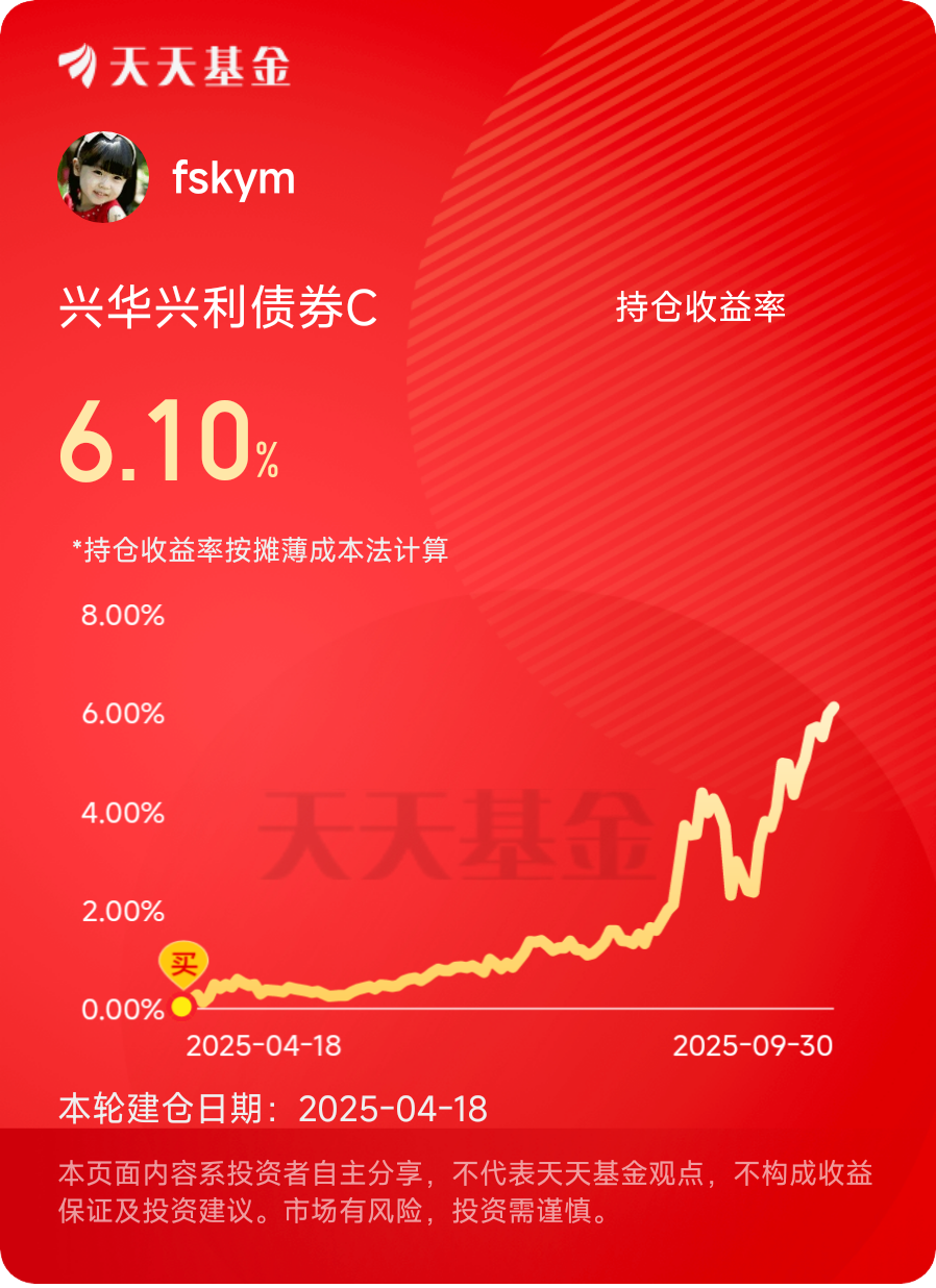作为试过股票基金、踩过存款利息坑的理财小白,定投$兴华兴利债券C$这一年,算是真正找到适合普通人的“躺平理财法”,最惊喜的是心态彻底稳了,以前买股票基金,每天早上睁眼第一件事就是刷净值,跌两个点就吃不下饭,涨一点又慌着要不要卖。但$兴华兴利债券C$不一样,它大部分钱投在债券这种稳当资产里,只有小部分碰股票,就算遇到市场大跌,回撤也特别小,去年市场最差的时候,$兴华兴利债券C$ 也就跌了1.5%,比起朋友手里跌20%的股票基金,简直是“避风港”,定投之后更不用纠结时点,涨的时候买的份额少,跌的时候自动多买些,成本慢慢就摊平了,根本不用天天盯盘。