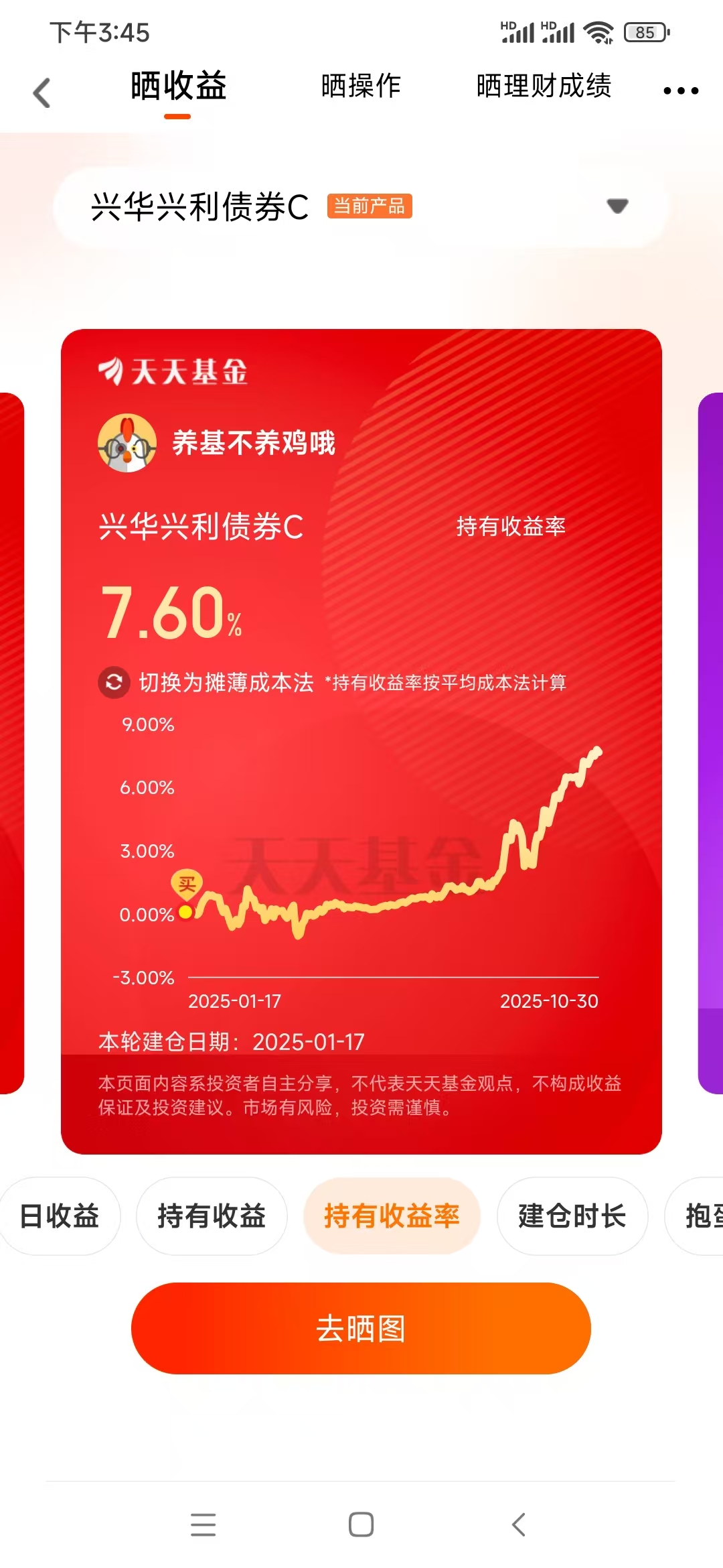 说完了定投方式,再聊聊投资规划。最近债市转暖,我决定定投加仓兴华兴利债券C(021518),我今年1月买入的它,当前收益率大约是7.60%,我觉得它具备非常多的优势。