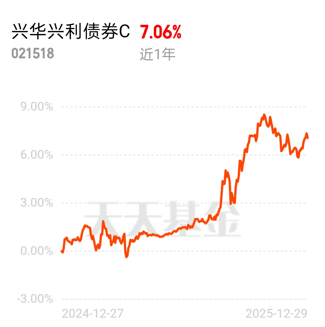#晒2025收益,启2026新程!# 在过去一年,持有$兴华兴利债券C$ 的收益率,获得了超过7%的收益率,虽然跟一些权益类基金没法比,但远超同期一年期银行存款利率,如果是追求稳健投资的话,这款基金产品将是非常不错的选择。对于2026年,我期待整个市场能够稳中有升,不要出现过于震荡和快速涨跌的情形,作为个人投资者每年拥有稳健的收益率就是不错的投资。@兴华基金 $兴华兴利债券C$