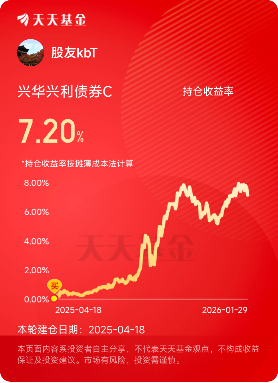 对于2026年,我对兴华兴利的期待其实很简单,就是继续把它的固收+优势发挥到底。一方面希望它能守好债券这个基本盘,在震荡的债市中把握节奏,把基础收益稳稳攥住;另一方面也期待它的权益灵活仓位能精准踩中市场热点,不管是选赛道还是挑标的,都能拿出好眼光,在控制风险的前提下,给我们带来实实在在的超额收益。@兴华基金
