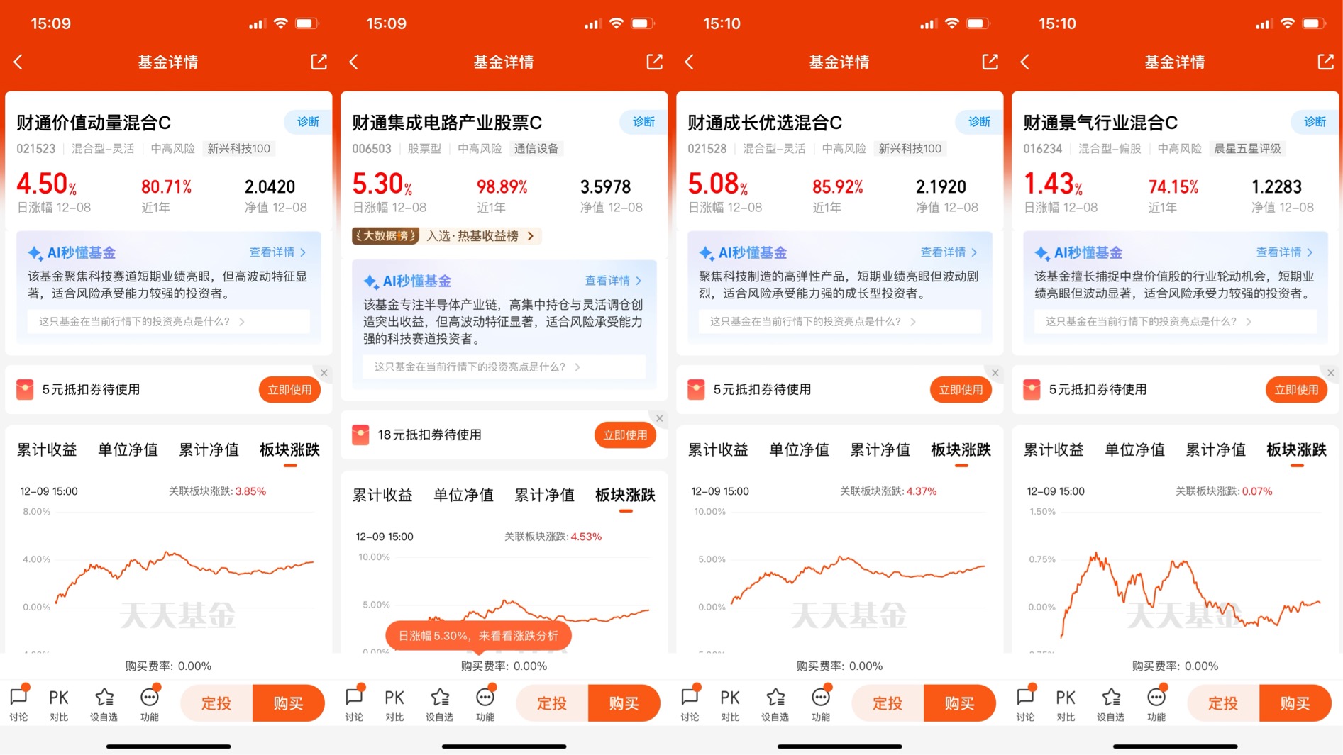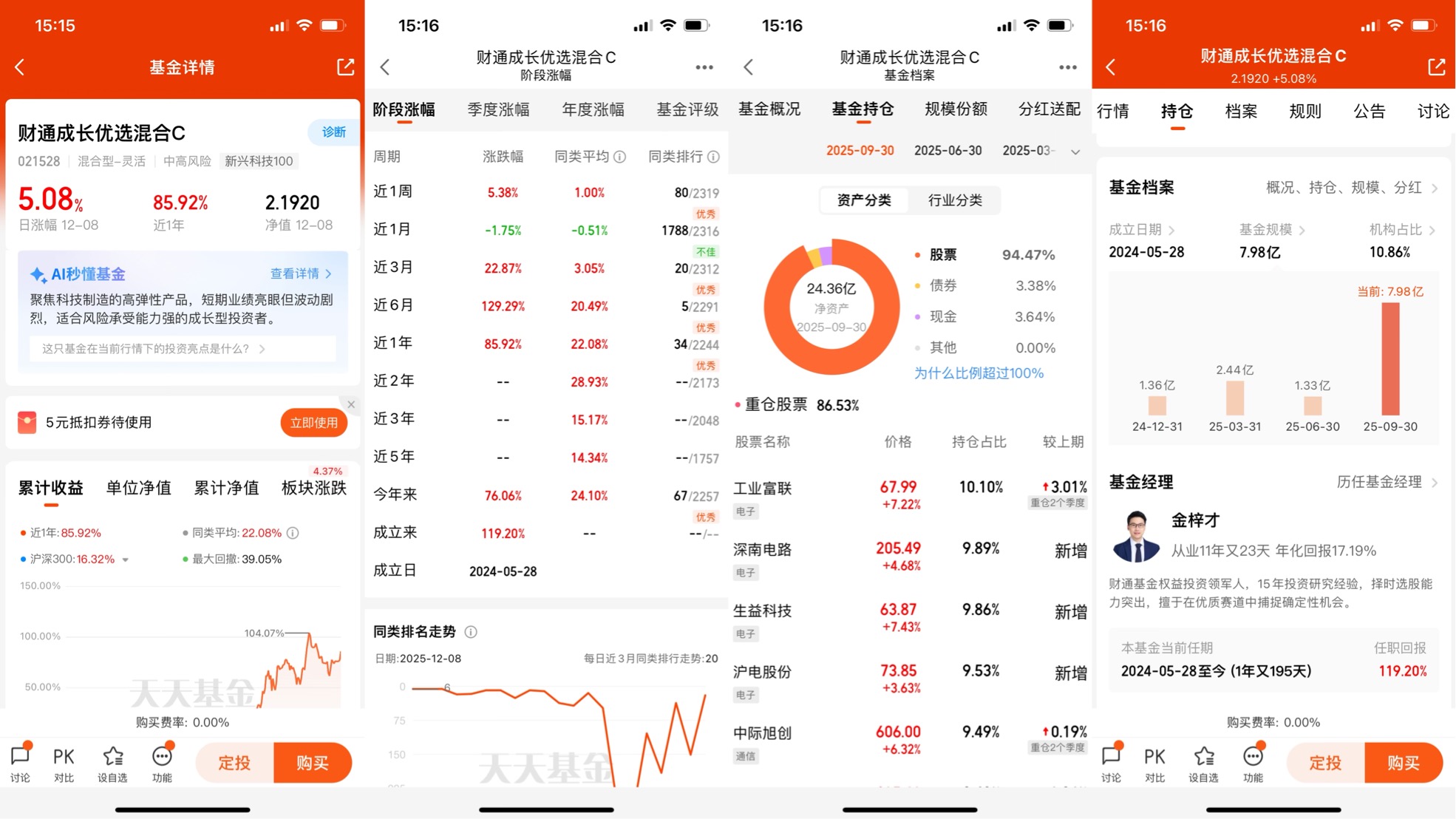 聊完产业逻辑,该说说咱们普通人怎么参与了,直接炒股风险太大,选基金是更稳的办法。我最近盯了四只财通的基金,都是瞄准AI赛道的,风格各有不同,能覆盖不同需求,今天就给大家详细介绍一下: