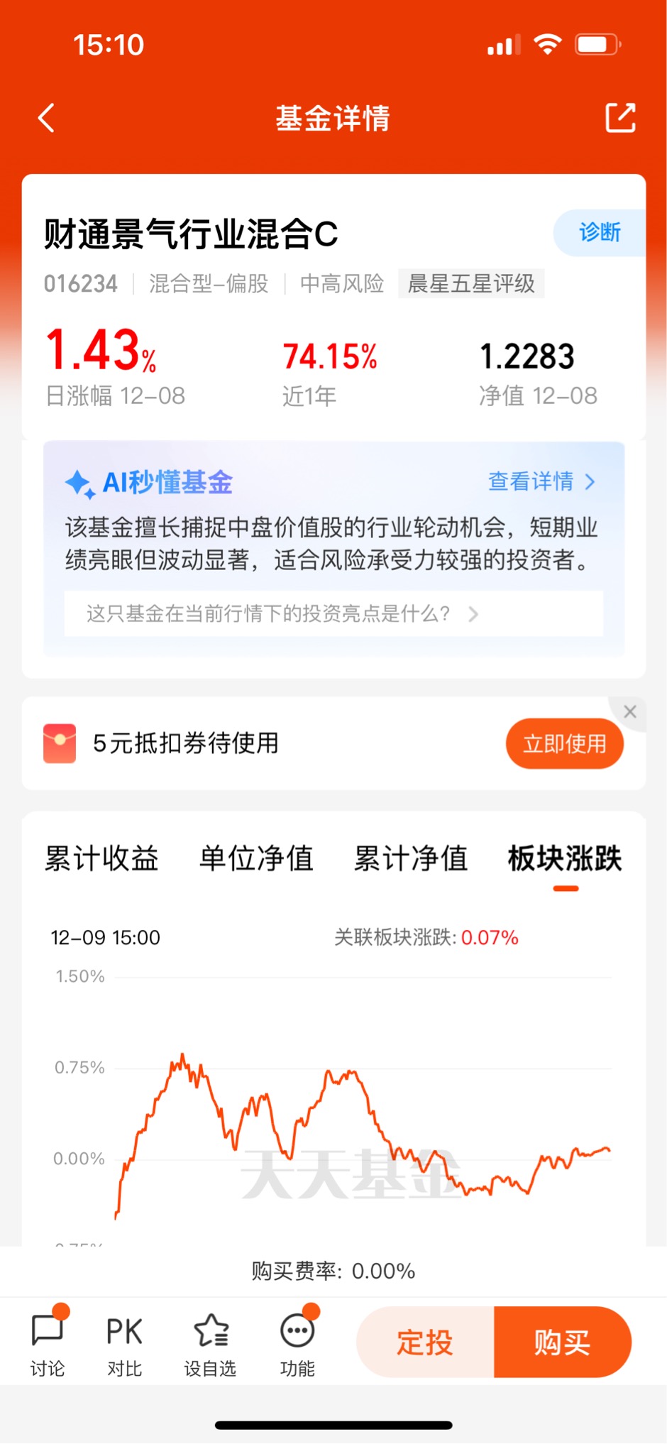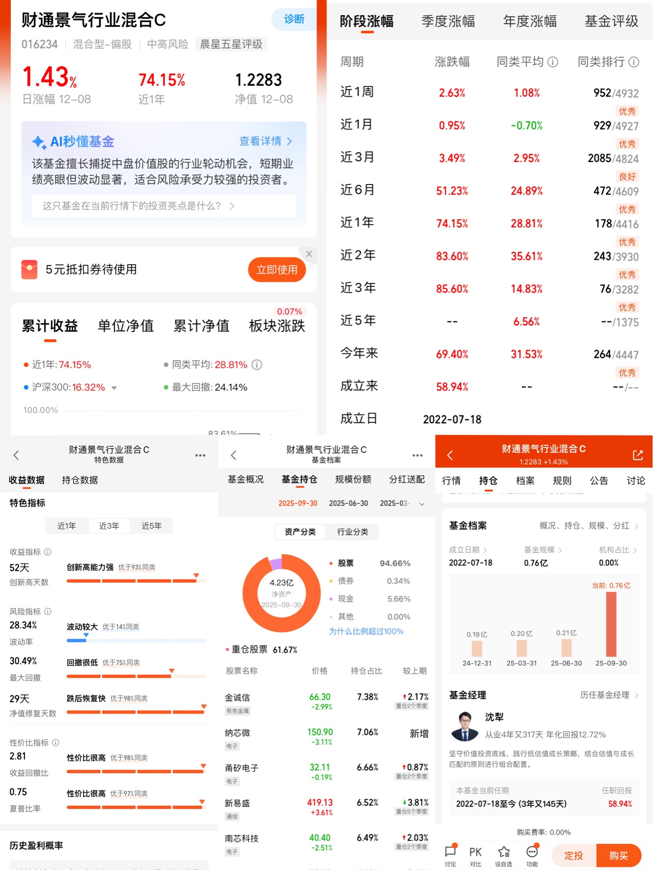 最后是财通景气行业混合C(016224),这只和前面三只不一样,基金经理是沈犁,风格是“聚焦景气行业,抓高成长”,核心布局AI和半导体,近一年涨了74%,比同类平均高了50个点,业绩也很能打。