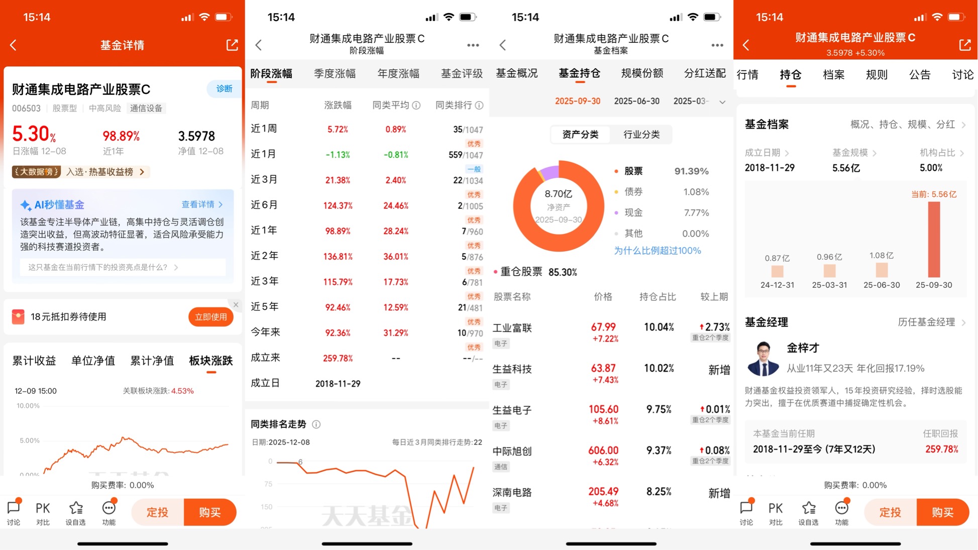 然后是财通集成电路产业股票C(006503),这只就是纯AI上游的“硬货”,专门搞半导体和算力链,还是金梓才管的。半导体是AI的“心脏”,大模型训练、AI应用都离不开芯片,算力链里的光模块、PCB是“血管”,这俩都是AI产业的刚需,业绩确定性最强。