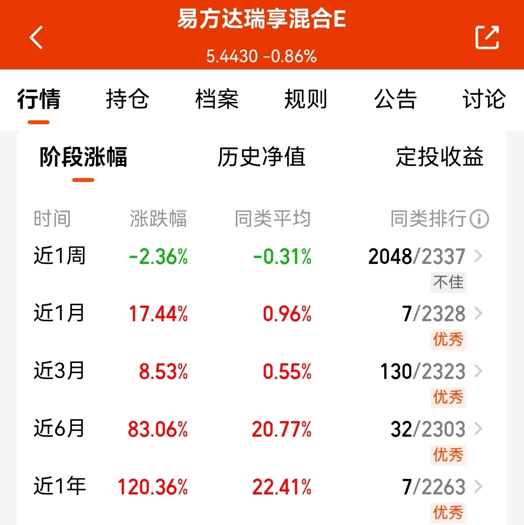 $易方达瑞享混合E$ 这支也是跟随CPO板块,近半年涨了83.06%了,10年里紧密把控成长机会,震荡市场能抗跌,行情较好时,也能及时跟上,博取超额收益,我觉得还是不错的!