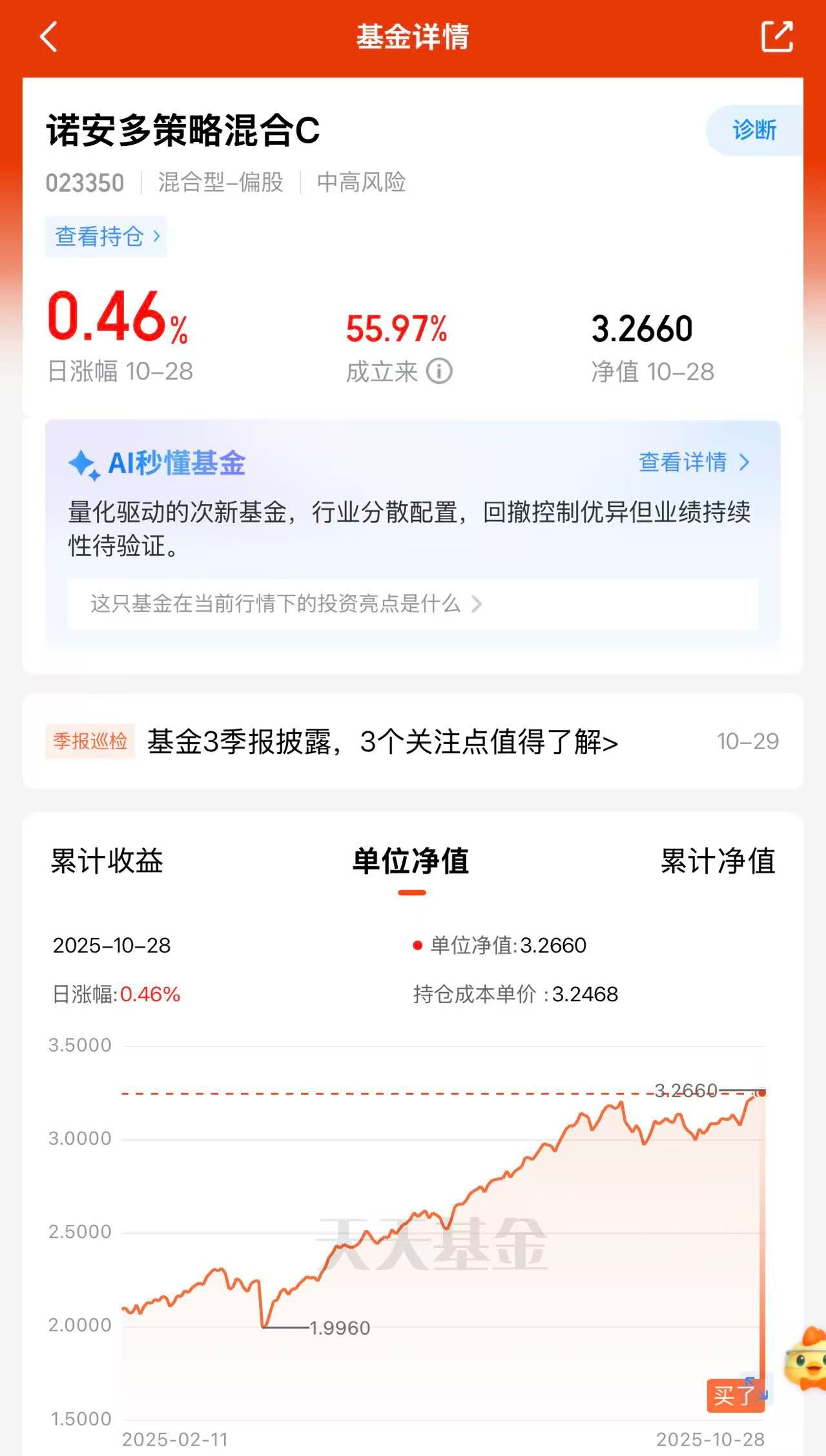 以前总羡慕别人买基金赚快钱,后来买了诺安多策略混合C(023350)才明白,稳稳的收益更可贵。它虽然偶尔也会跌,但从来不会大跌后爬不起来,反而每次调整都是加仓机会,这种复利增长才实在。#黄仁勋最新演讲勾勒AI宏伟蓝图#