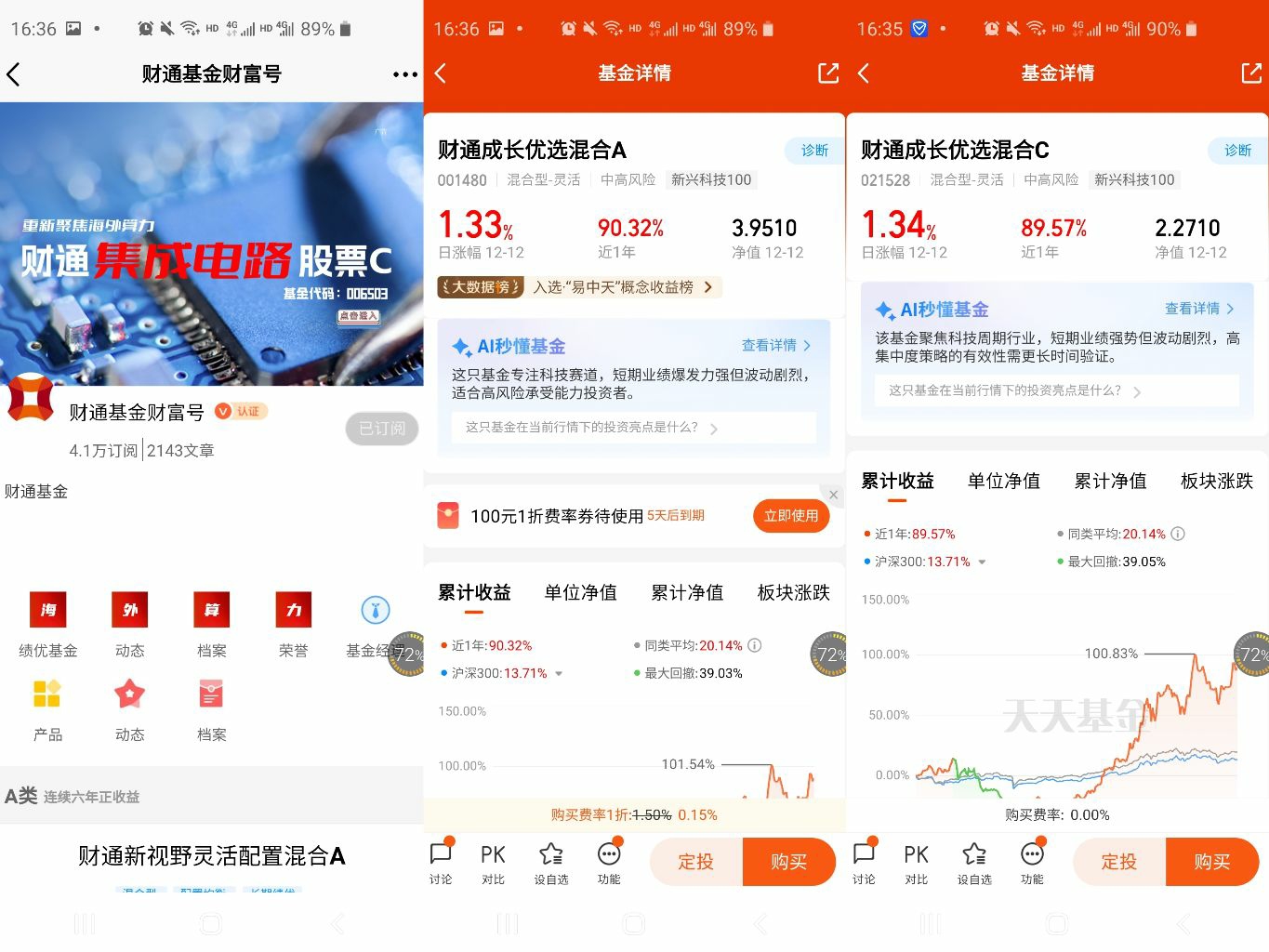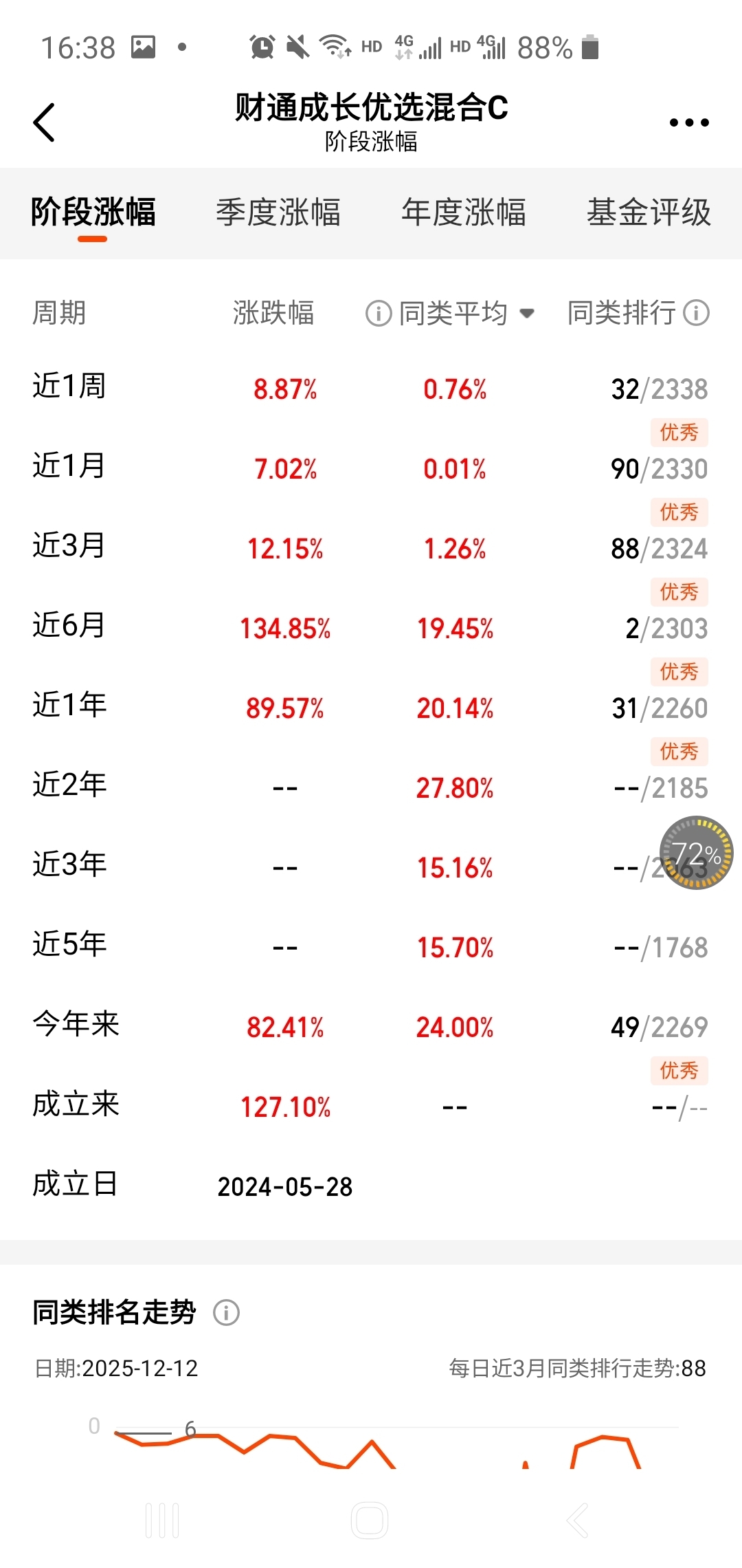 $财通成长优选混合C$入选“易中天”概念收益榜单,是一支灵活型的混合基金,专注科技赛道,电子、通信行业持仓占比超80%,紧跟科技周期与产业升级趋势。重仓持有:工业富联、深南电路、生益科技、沪电股份、中际旭创、生益电子、新易盛等。自2024年5月成立以来,收益率高达127.1%,近1年达到89.57%,非常优秀!