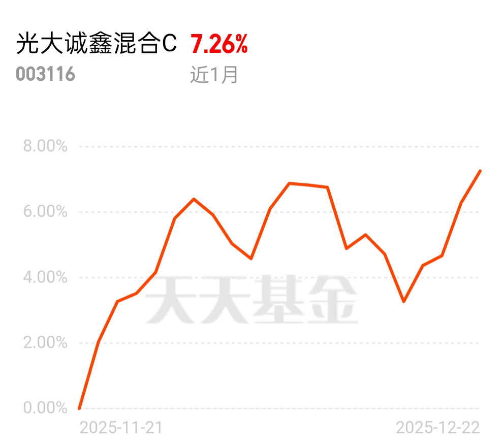 存款利率下行,越来越多人把钱转去基金理财。光大诚鑫混合 C 没让人失望,近 1 个月收益 7.26%,业绩稳、风格实,不用承受太高风险,就能拿到不错的回报。$富荣福锦混合C$ $金鹰责任投资混合A$ $同泰远见混合A$