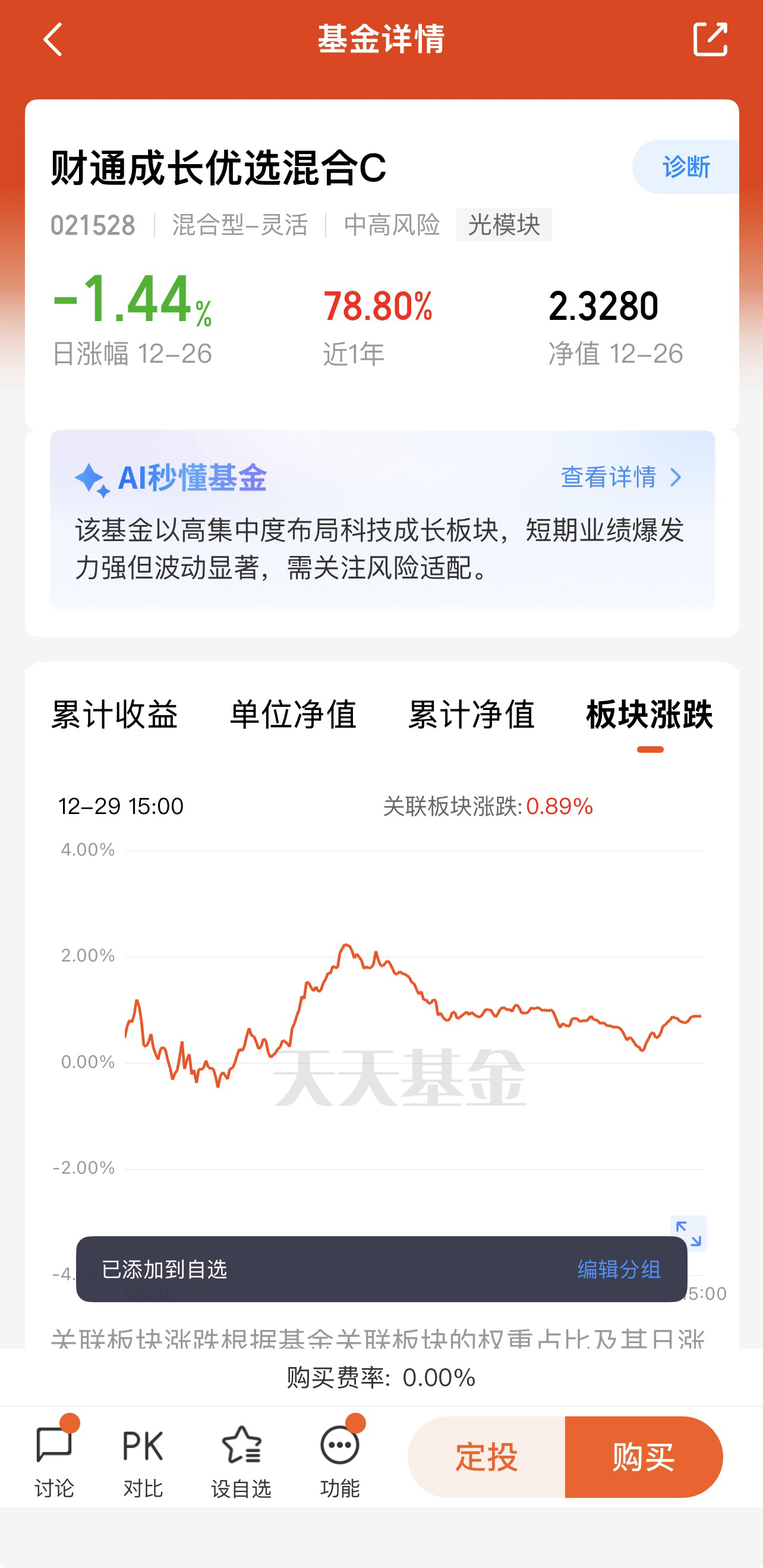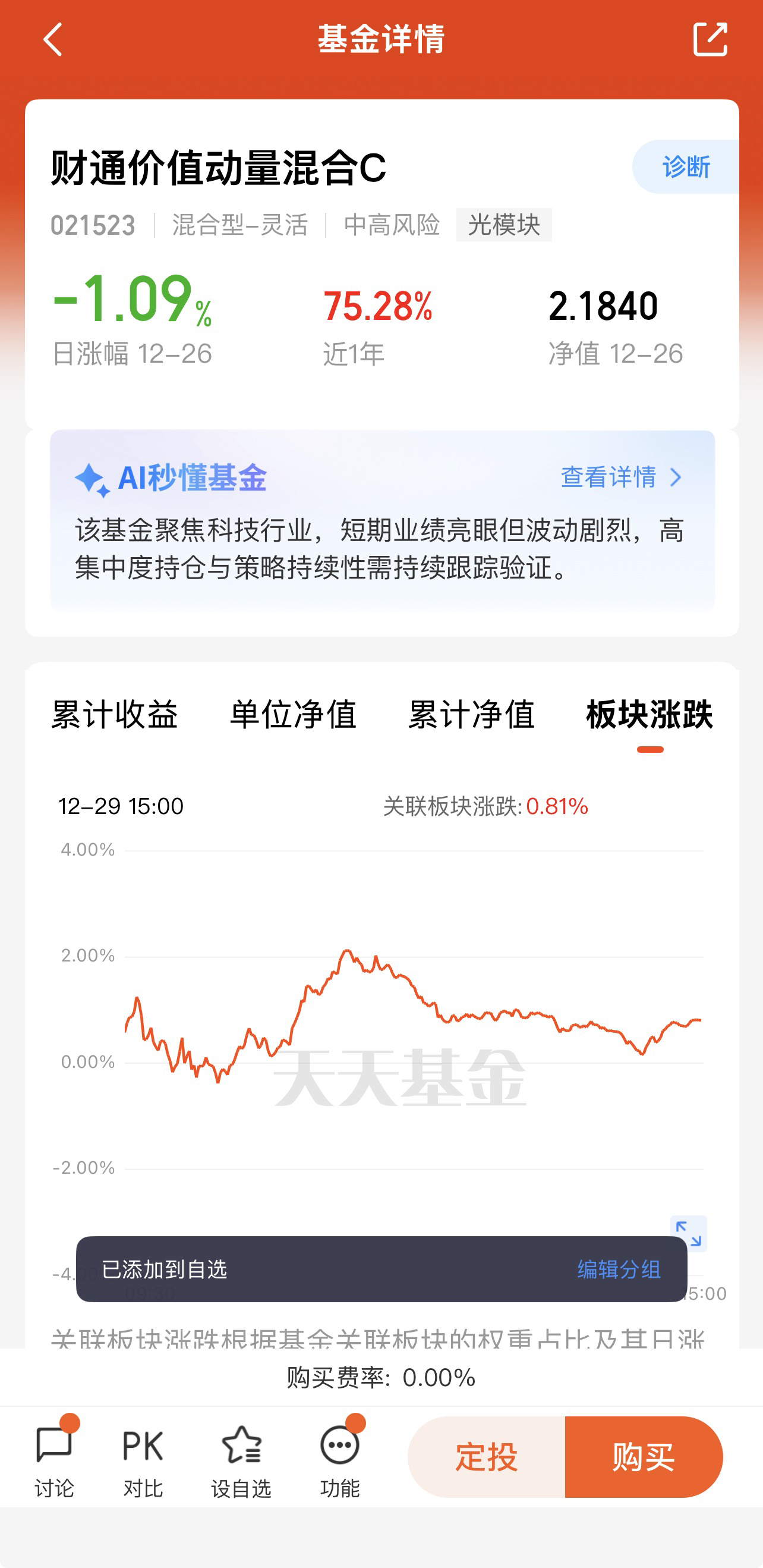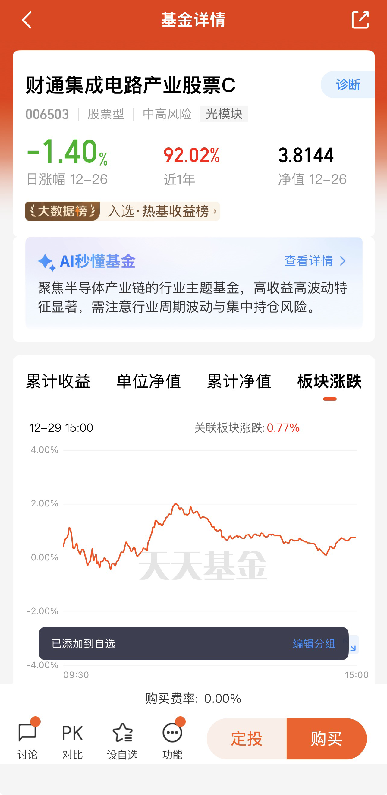混合型基金以“价值+动量”为核心策略,聚焦基本面扎实、估值合理的企业,行业配置相对分散(避免单一赛道集中风险)。从业绩数据看,近12个月涨幅75.28%,低于集成电路基金,但日涨跌幅波动更平缓(12月26日日涨跌幅-1.09%,小于集成电路基金),抗跌性更强,是组合中的“风险缓冲垫”。