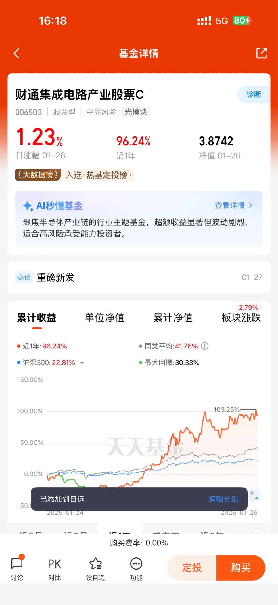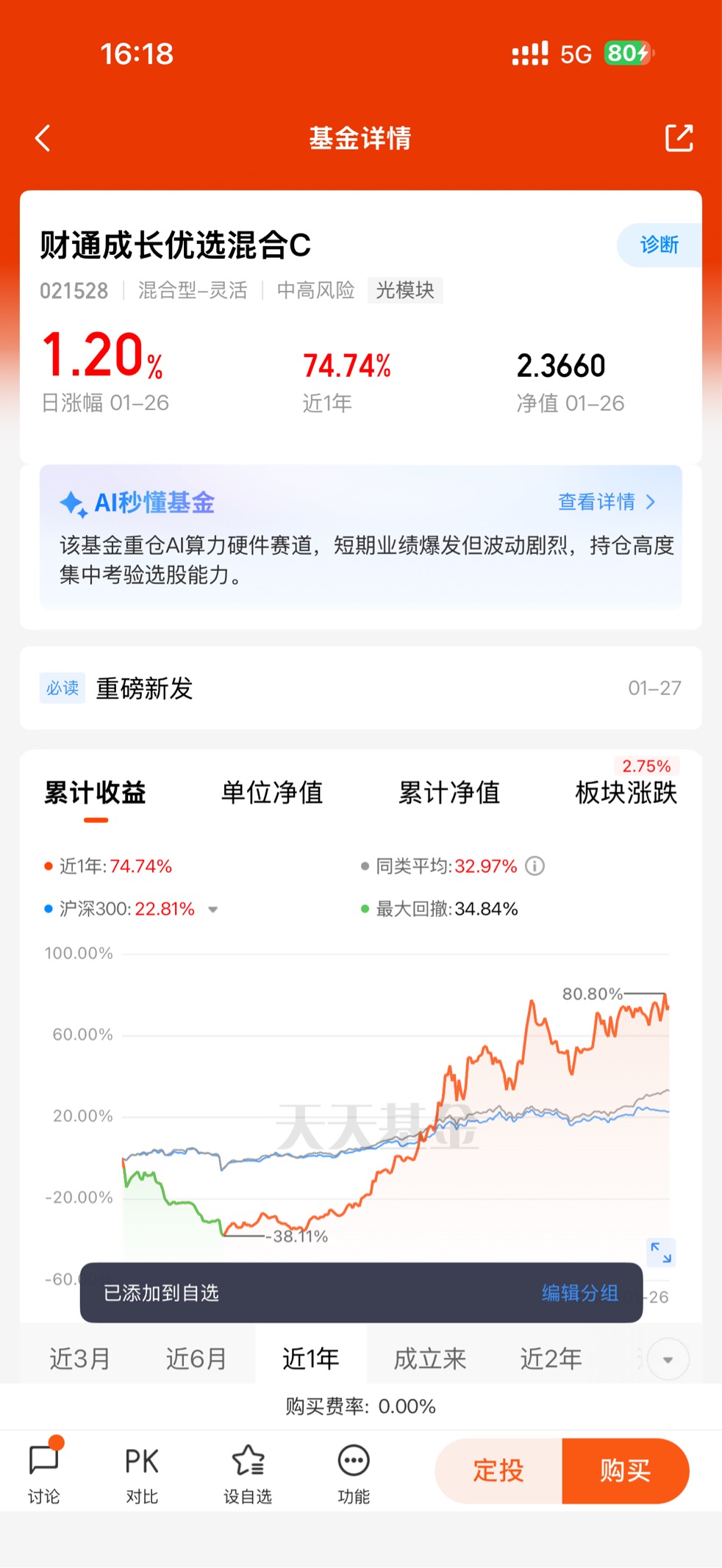 同时,基金的分散化持仓也让我规避了单一标的的风险。不同于重仓某一只AI龙头的基金,财通成长优选C覆盖了从硬件制造到通信设备的多个细分领域,即使部分个股短期回调,也能通过其他标的的上涨对冲波动。这种“聚焦赛道+分散个股”的配置,让我在持有过程中更显从容,无需因短期波动而频繁操作。