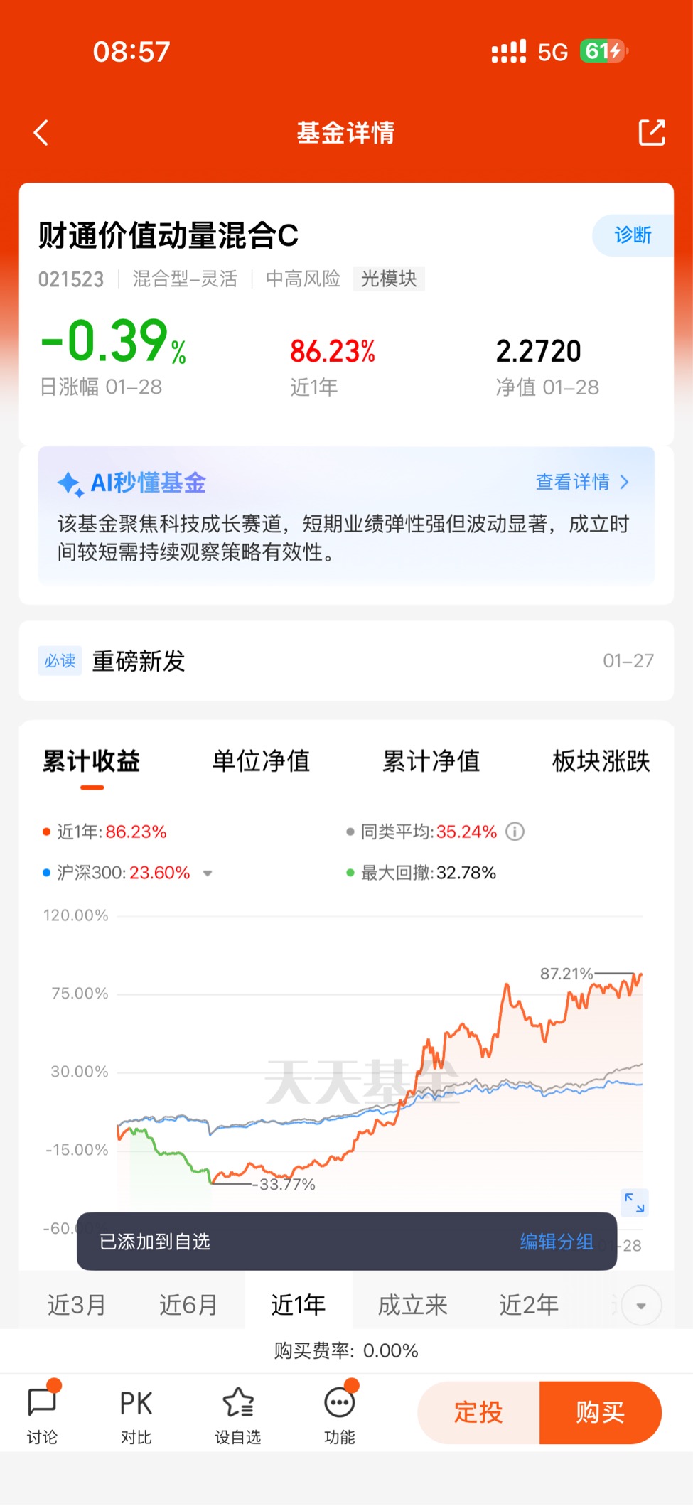 作为财通基金旗下的明星成长型产品,财通成长优选混合C(基金代码:021528)自2024年5月成立以来,凭借精准的赛道布局和凌厉的进攻风格,在短短一年多时间里创造了惊人收益。截至2026年1月28日,基金最新净值达2.4210元,尽管当日微跌0.45%,但长期收益曲线堪称陡峭:近12个月收益率高达88.26%,近6个月收益更是飙升至86.23%,近3个月和近1个月收益率也分别达到4.67%和3.99%,在248只同类基金中稳居前列,其中近6个月排名跻身前2%。