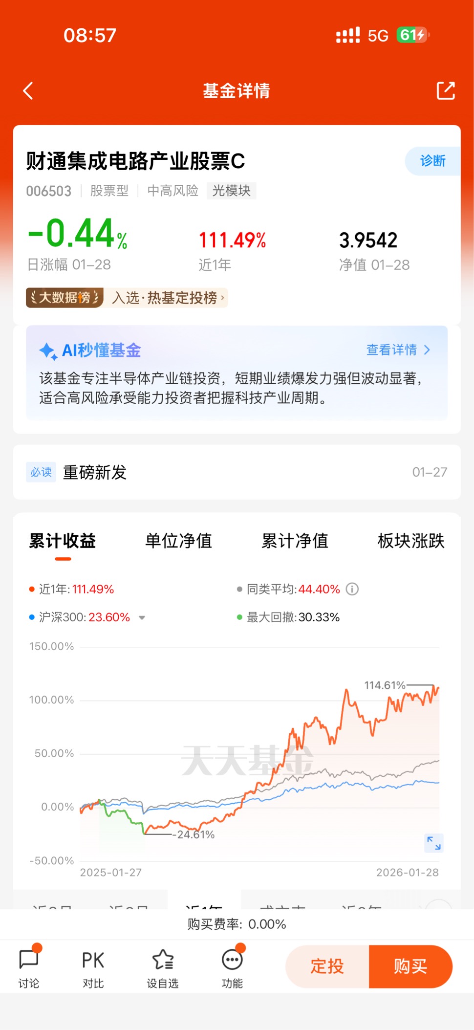 财通成长优选混合C用不到两年的时间,以翻倍的收益证明了其在硬科技赛道的投资实力。高度聚焦的赛道布局、高仓位的进攻策略、精细化的风险控制,使其在科技产业升级的浪潮中脱颖而出。2026年,随着AI、半导体、通信等核心赛道的成长红利持续释放,这只基金有望延续业绩爆发力,为投资者带来丰厚回报。对于想要布局硬科技赛道、追求长期高收益的投资者而言,财通成长优选混合C无疑是一款值得重点关注的优质产品,它将以专业的投资运作,帮助投资者精准把握中国科技产业的成长机遇。
