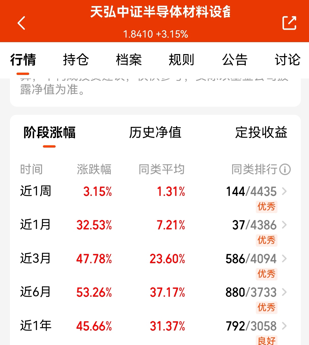 $天弘中证半导体材料设备主题指数发起C(OTCFUND|021533)$半导体设备回调就是机会,业绩确实可圈可点,近一年涨幅达45.66%,近三个月涨幅达47.78%,同类平均排名靠前,确实也很优秀,而且当前AI大模型的用户渗透率仍较低,产业化应用周期才刚开始,大模型带来的半导体材料设备投资方兴未艾,长期成长空间将极为广阔,今天先加1000元了。