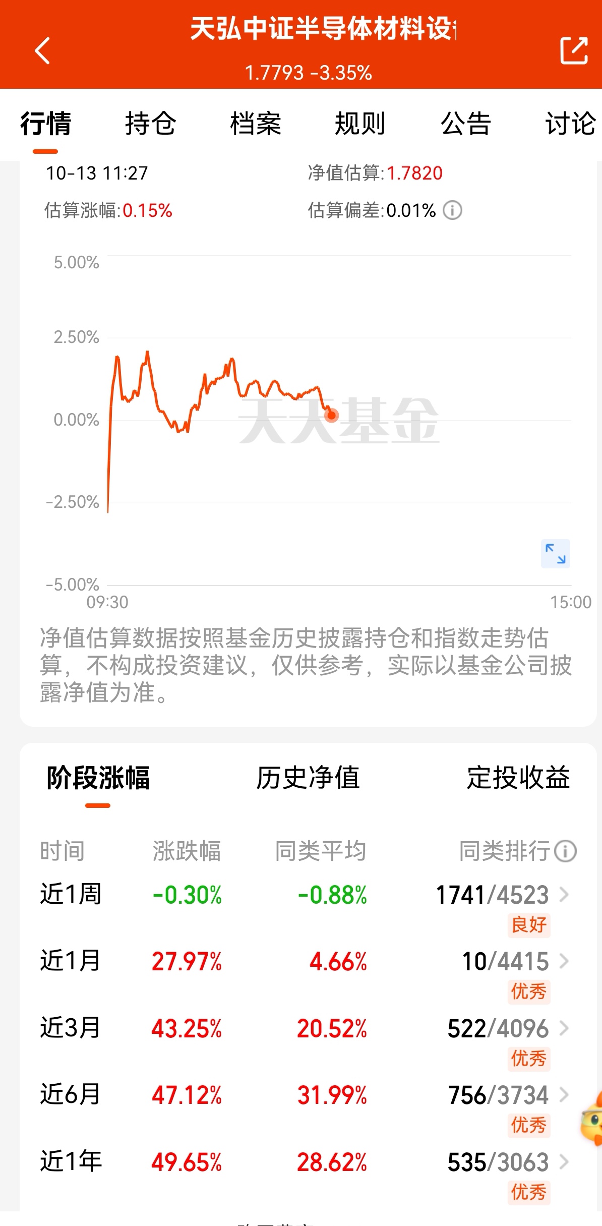 $天弘中证半导体材料设备主题指数发起C(OTCFUND|021533)$半导体设备今天还算强势的,已经翻红了,目前涨幅0.15%,果然每次回调就是机会,反弹起来也很快,业绩确实可圈可点,近1个月涨幅达27.97%,近3个月涨幅达43.25%,同类排名很靠前,现在上面大基金三期落地提供资金支持,AI芯片商业化突破带来增量需求,这些因素共同支撑半导体材料设备指数长期成长逻辑,所以可以继续做定投。