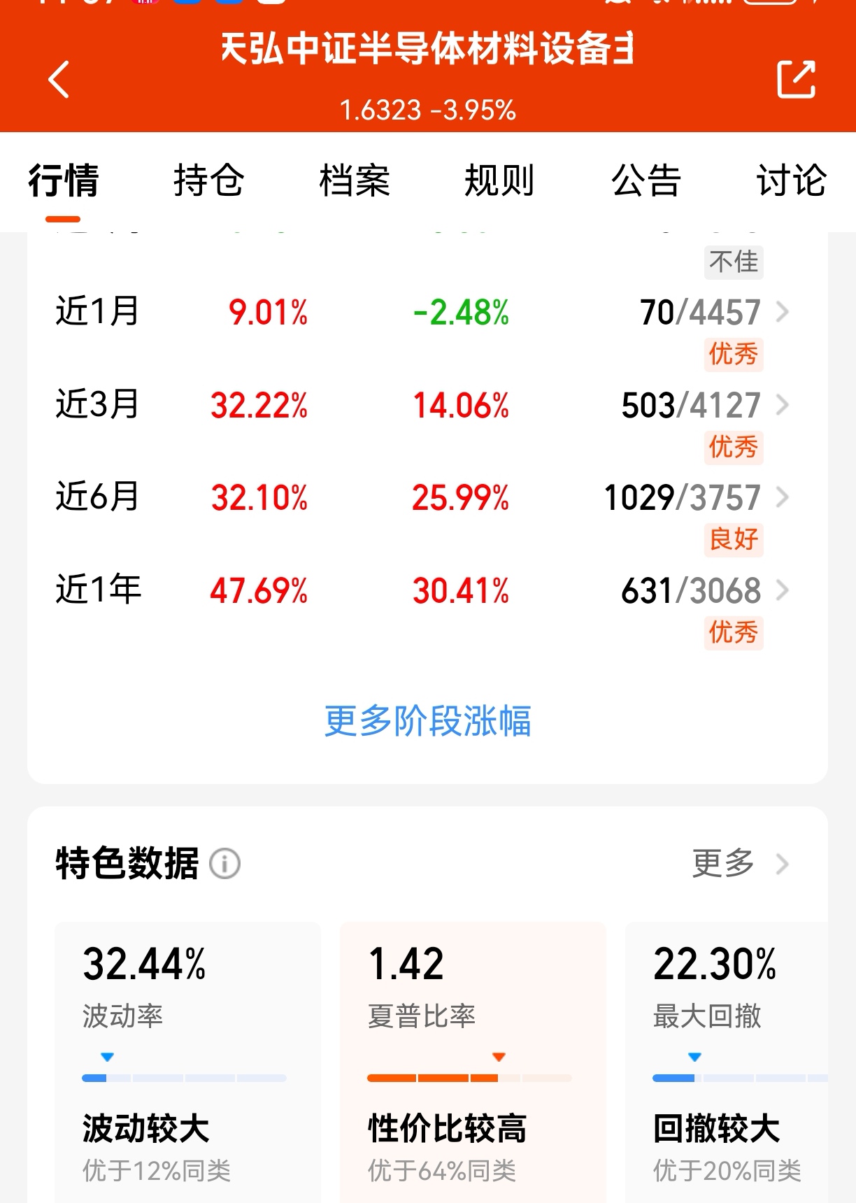 $天弘中证半导体材料设备主题指数发起C(OTCFUND|021533)$上周五回调就是倒车接人的,今日开始反弹了,目前涨了1个点,近1个月涨了9.01%,同类平均跌了2.48%,近3个月涨了32.33%,同类平均才涨了14.06%,足足翻倍了,排名非常靠前,业绩确实可圈可点,关键是利好也挺多的,现在只要耐心拿住继续等涨就行了。