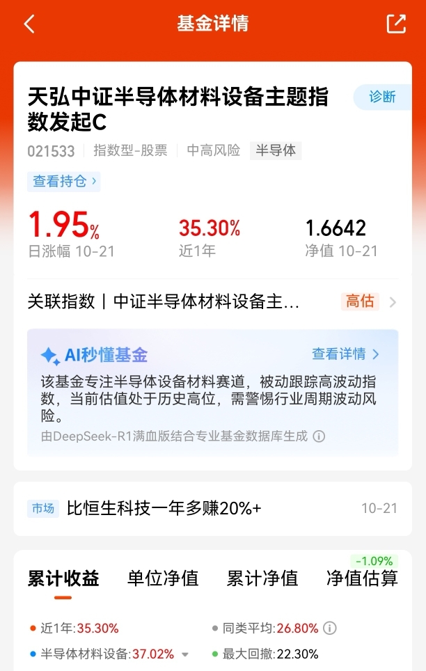 $天弘中证半导体材料设备主题指数发起C$ 半导体设备好歹有跌有涨,业绩确实可圈可点,回调就是机会,业绩也很好,近一年反弹超35.30%。这只基金买入0申购费,满七天卖出0赎回费,费率也有优势,操作起来也很灵活,今天加2000元,先平摊下持仓成本。
