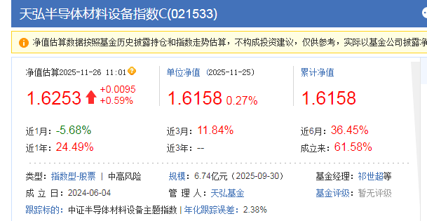 $天弘半导体材料设备指数C(OTCFUND|021533)$今天半导体及设备等板块再度上攻,这已是该基金连续第三日收涨,昨日涨了0.27%,前天涨了2.09%,已经成功吃到肉肉,今日估值继续走高,全产业链布局的优势正在持续显现,而且这只基买入0申购费,满7天买吃0赎回费,确实操作起来也很灵活,等大涨一波再止盈上周加的仓位,先拿住了。