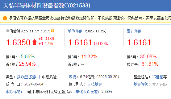 $天弘半导体材料设备指数C(OTCFUND|021533)$今天半导体设备继续反弹,目前涨幅1.17%,本周表现确实还不错,业绩可圈可点,拉长周期看业绩也很好,近3个月涨幅达11.32%,近6个月涨幅达35.08%,因为外围的限制,我们在近几年大力支持芯片的发展,也取得了不少技术突破,相信后面也会有更多壁垒被突破,或将改写芯片的行业格局,半导体材料设备是关键环节,而且当前市场整体来看,还是以成长赛道的轮动上涨为主,我要继续拿住了,期待稳稳吃肉!