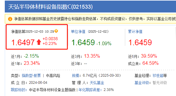 $天弘半导体材料设备指数C(OTCFUND|021533)$说实在的,买了半导体设备之后,吃肉的时间还是多了不少的,业绩确实比较香,近3个月上涨13.35%,近6个月上涨39.59%,同类排名靠前,关键是半导体芯片及其设备的确定性还是比较高的,因为外围的限制,我们在近几年大力支持芯片的发展,国产替代逻辑也在逐年增加,回调补补仓,继续拿住就是。