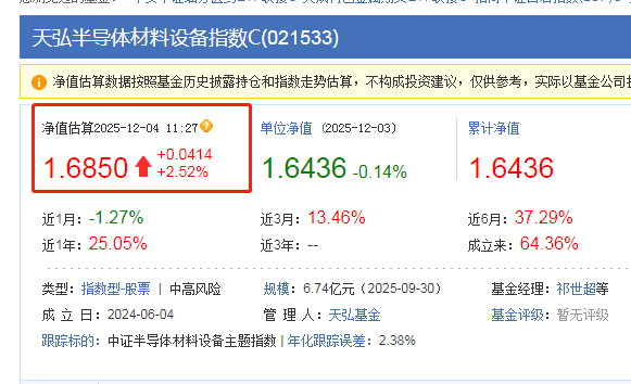 $天弘半导体材料设备指数C(OTCFUND|021533)$牛啊,早就说了半导体设备回调就是机会,果然是这样,今天又大涨了,目前涨幅超2.52%,不得不说很优秀啊,近6个月涨幅超37.29%,业绩也是非常靠前的,关键是买入0申购费,满7天卖出0赎回费,操作起来也很灵活,现在半导体利好也多,相信后面也会有更多壁垒被突破,或将改写芯片的行业格局,半导体材料设备是关键环节,可以拿住了。