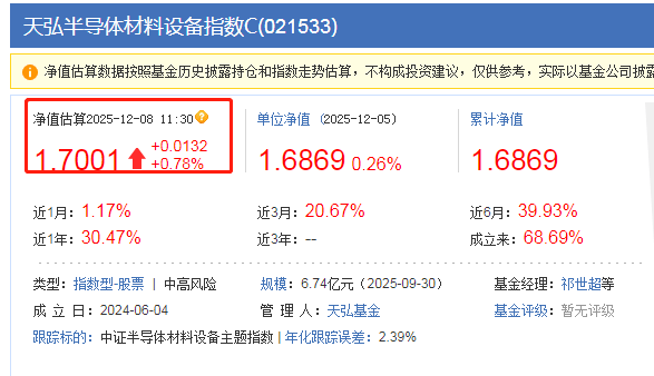 $天弘半导体材料设备指数C(OTCFUND|021533)$不得不说还是得看半导体,科技板块,今天继续涨,加今天连涨3天,红彤彤的真不错呢,业绩确实也是可圈可点的,近3个月上涨20.67%,近6个月上涨39.93%,关键费率也有优势,买入0申购费,满7天卖出0赎回费,操作起来也很灵活,现在国产替代是趋势,半导体设备前景也很好,一定要拿住了。