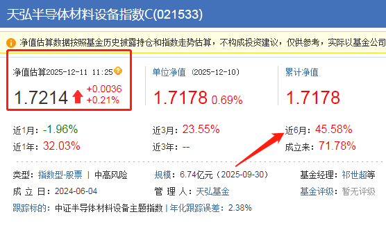 $天弘半导体材料设备指数C(OTCFUND|021533)$半导体设备今天继续反弹,昨天涨了0.69%,业绩确实不错,涨多跌少,近6个月上涨超45.58%,比很多基近一年甚至是近2年的收益还要高一些,这只基金主要跟踪半导体材料和设备领域的龙头企业,覆盖了芯片制造的上游关键环节,相比单纯投资单一个股,它通过一篮子组合分散风险,更稳健地把握行业整体机遇,前景也好,所以说一定得拿住了。