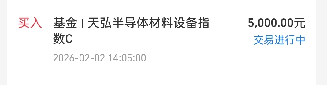 $天弘半导体材料设备指数C$ +5000,今天继续来低吸半导体,最近这几天调整挺多了,总体趋势没变,市场行情有大跌后面修复的也快,那就低吸捡些筹码放着。这只主要配置在半导体产业链的最上游材料”和“设备, 目前国内正在大力推进供应链自主可控,所以这些上游设备和材料公司的订单增长非常快,长期看,近6个月收益60.04%,近期,受市场情绪波动影响,半导体板块经历了一轮深度调整,这并非利空,反而是个黄金坑,AI算力的爆发式增长,对高性能芯片提出了前所未有的需求,这直接拉动了上游材料与设备的旺盛景气周期,今天低吸5000放着了。