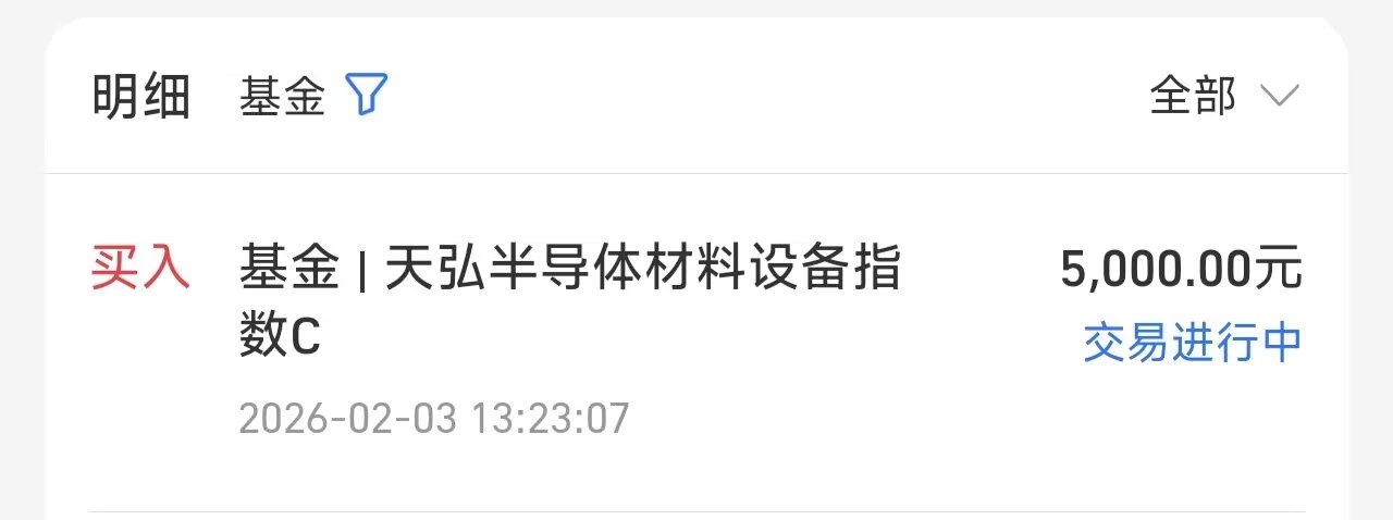 加仓5000元$天弘半导体材料设备指数C(OTCFUND|021533)$,受益于AI算力需求、存储芯片涨价以及国产化突破等因素影响,半导体自去年起就已经进入新一轮上涨周期,该基金近6个月累计涨幅为57%,明显超越同类平均和沪深300指数,近几天大盘出现不小的波动,尤其是昨天A股,遭遇黑色星期一,大盘普跌,半导体也是出现不小的跌幅,但整体来看,影响半导体上涨的因素并未发生变化,比如目前存储市场仍然处于供需失衡状态,数据显示今年一季度PC内存价格涨幅可能突破100%,有望继续对半导体形成一定的催化。半导体牛市也不变,个人还是有信心的。