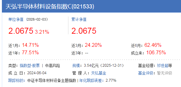 $天弘半导体材料设备指数C(OTCFUND|021533)$今天半导体、光模块等AI算力硬件股盘初走低,新易盛、中际旭创跌超5%,寒武纪跌超3%,海光信息、中芯国际跟跌。回调可以慢慢补仓,半导体设备中长线业绩还是不错的,昨天涨了3.21%,近6个月上涨62.46%,近1年上涨77.51%。而且近期新型半导体材料技术突破,科学技术团队在二维离子型软晶格材料中,实现了可编程、原子级平整的“马赛克”式异质结的可控构筑,为高性能发光和集成器件研发开辟了新路径;叠加相关公司签订签订重大合同,总金额13.11亿元的半导体测试设备及其配套治具销售合同,后续或会刺激行情继续上涨。
