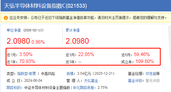 $天弘半导体材料设备指数C(OTCFUND|021533)$节后半导体及其设备表现还不错,今天有反弹,年前就反弹了,也拿住了筹码,晚上可以加鸡腿了,业绩确实可圈可点,近6个月上涨59.46%,近1年上涨70.93%,刚看前十大持仓八家都红彤彤的,而且近几年全球半导体产业风云变幻,在半导体设备领域,一批具备国际竞争力的企业正快速崛起,成为国产替代的主力军。A股半导体设备行业正处在国产替代加速与技术快速迭代的关键阶段,可以定投拿住了。