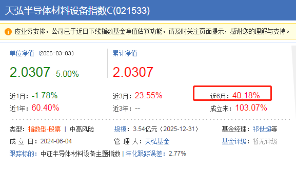 $天弘半导体材料设备指数C(OTCFUND|021533)$太难了,居然还在跌,这只基必须含泪补仓,先降低一下持仓成本也行,毕竟前景还是不错的,而且业绩也可以,近6个月上涨40.18%,近1年上涨60.40%,费率也有优势,买入0申购费,满7天卖出0赎回费,在明确的产业趋势、强劲的资本开支与持续的政策支持共振下,板块的每一次调整,都可能成为长期布局的机遇。不过分批慢慢来,毕竟还有外围的影响在,今天加5000元。