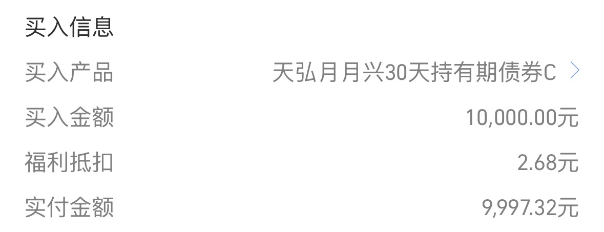 历经前期调整后,债市终于一扫阴霾迎来回暖行情,资金面维持宽松,短端债市企稳力量持续增强!今天继续加一笔天弘月月兴,作为低风险理财优选,主投中短债,在债市回调时月月兴表现出了优秀的抗波动能力,各阶段均为正收益,它的纯债策略在回暖行情中更具优势,101.92%信用债打底,搭配7.21%利率债灵活捕捉波段机会,不仅走的非常稳,从业绩来看也比较可观,近1年收益率达2.43%,远超余额宝的收益,走势平稳无大幅起伏,当前货币政策延续适度宽松基调,短债资产配置性价比高,讨论区领了个,阿诗继续加10000元~