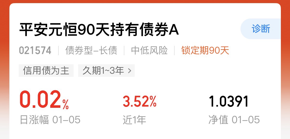 新年第一天债市低开,但是$平安元恒90天持有债券A$ 今晚稳稳收了2个蛋,真是让我太惊喜了呢,债基拿着就是得要这种稳稳当当的,近一年收益3.52%,比纯债收益好,比固收更稳当呢。
