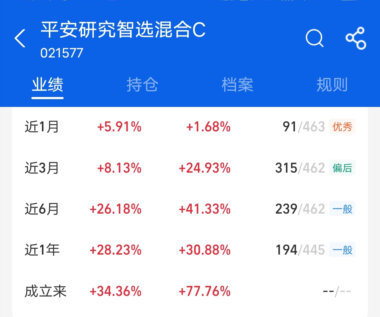 自从11月份以来,我观察了一下,在这两个星期里面,就只涨了两天,其余天数很多板块都在回调,不过我刚刚闲逛的时候我发现了这个$平安研究智选混合C$ 居然在近期涨得还不错,近一个月涨了5.91%,在同类中也显眼啊,近半年涨了26.18%,看了布局泛制造业,精选工程机械、板式家具设备等领域景气度底部、估值压缩的龙头标的,怪不得实力还是挺强的。