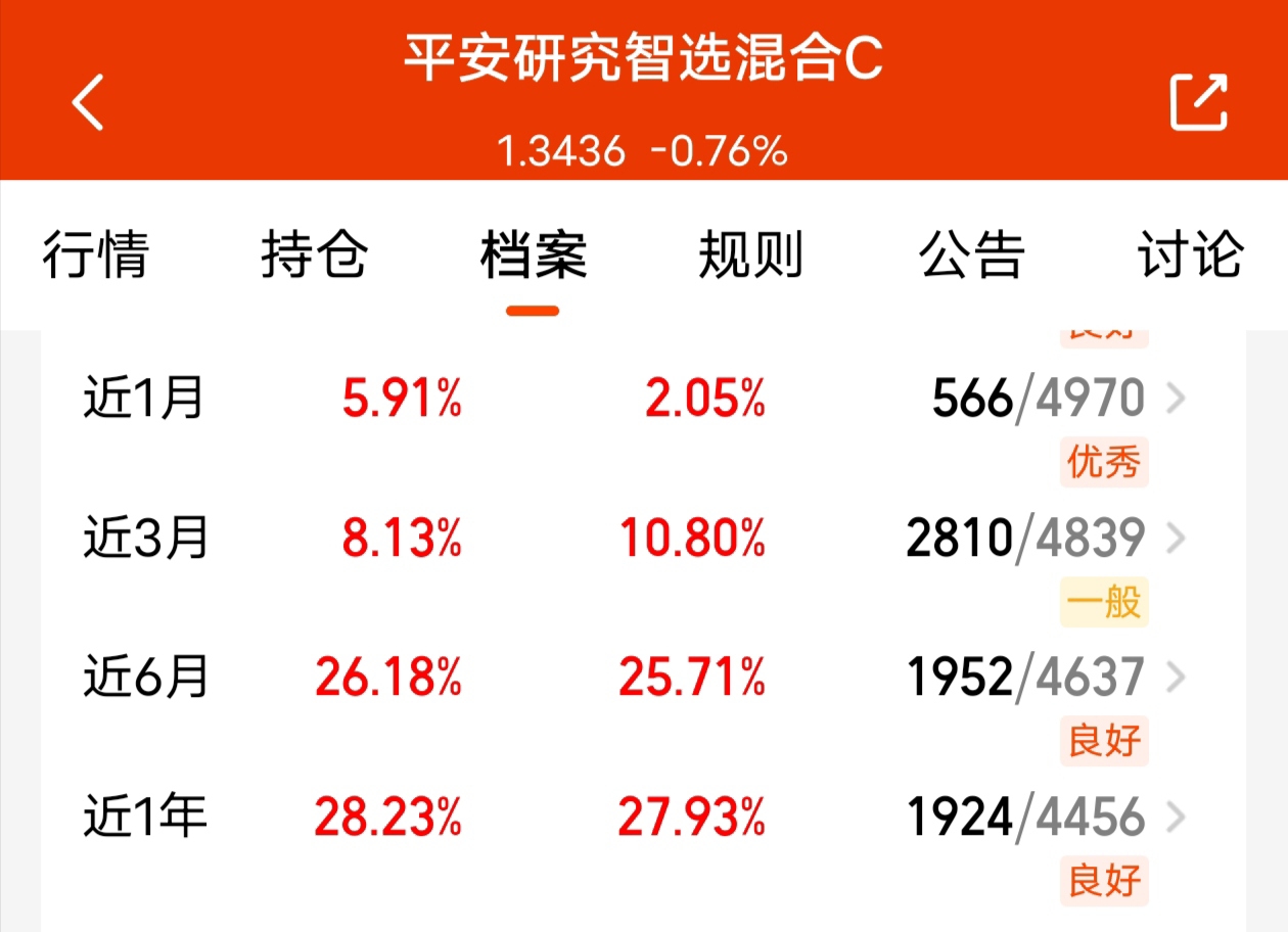 一到周六,就想复盘一下,这个星期四涨了,以为要迎来反弹了,没想到周五居然来个继续调整了,这一久来,回调都挺多的,不过我今天看了这个$平安研究智选混合C$ 近期不但没有回调多少,还涨了,近一个月还涨了5.91%,半年涨超26%,抗跌性也可以,想周五很多同类都大跌,这个才跌0.76%,还是很温柔的,聚焦泛制造业龙头,很有潜力,关注了。